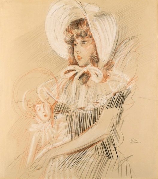 Curator: Oh, there's a wistful innocence about this one, isn’t there? Paul César Helleu captured this little "Fillette regardant vers le haut"— Girl Looking Up— with such delicate pencil strokes. Editor: Indeed. This portrait drawing sparks immediate reflection on the historical and social contexts framing childhood and female representation. Who was she? And what was she looking at? Curator: That upward gaze! You can almost hear her wondering, can't you? Helleu, master of capturing fleeting moments, leaves her story delightfully open to interpretation. The soft pencil lines create a gentle vulnerability. Editor: Precisely. Her upward gaze reads as a quest, but to where? To a hopeful future, maybe. As a portrait of a young girl, it’s difficult not to place this gaze within the art-historical conventions of passive female beauty versus the burgeoning concept of young women making choices. The slight but assured lift of her chin offers subtle defiance. Curator: Defiance, perhaps... or simply hope, beautifully rendered. Helleu's impressionistic style leaves space for both, wouldn't you say? I imagine he noticed this girl just so, head tilted toward some fleeting wonder, and quickly tried to get her down on paper. Editor: His choice to capture this fleeting moment is significant, because it intersects with the emergence of new ideologies around girls education. How are we grooming girls’ ambitions and imagination for a world that consistently underserves them? The drawing functions, for me, as a reminder that girlhood has the capacity to dismantle boundaries. Curator: Yes! I think it also calls to mind a world on the precipice of tremendous change. A pre-war optimism, maybe? An artist capturing his subject with incredible speed, almost chasing the light... Or the potential for something else... something darker? Editor: Exactly. The power resides not only in the composition and skillful handling of pencil, but the socio-historical space that the artist and model inhabited and how the representation is interpreted. What possibilities opened up for her? Did she dare to reach for the proverbial stars? Curator: Questions for us all, I think. It’s just such an elegant, lovely, timeless image. Editor: Helleu presents a visual entry point from which to confront social expectations surrounding girls, prompting questions about empowerment. I won’t soon forget her gaze.