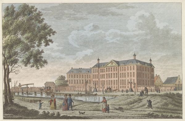 A. Lutz created this print of Paleis Noordeinde in The Hague sometime between 1810 and 1825. The architectural rendering is meticulously structured, creating a sense of depth and formal elegance. The composition is dominated by horizontal lines, subtly softened with organic forms through the trees and figures in the foreground. The rendering shows a study of light and shadow, and of surface against the backdrop of a serene sky. The subtle washes of color and detailed linework invite a reading of the building not just as an architectural structure, but as a cultural signifier of power and order. Note the subtle gradations of color and the precise rendering of architectural details. The formal language is controlled and orderly; this evokes a sense of stability. The artist creates a space for contemplation on the architectural structure and its place within the social fabric. The print’s subdued palette and detailed rendering serve not only as an aesthetic choice but as a reflection of broader artistic and philosophical interests in representation and perception.