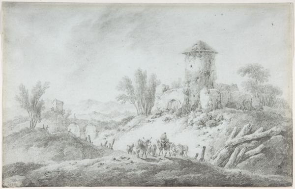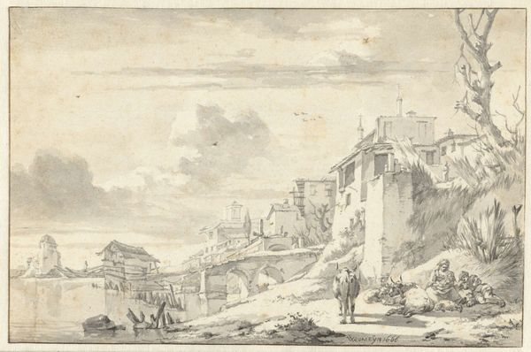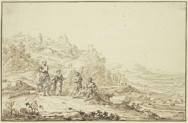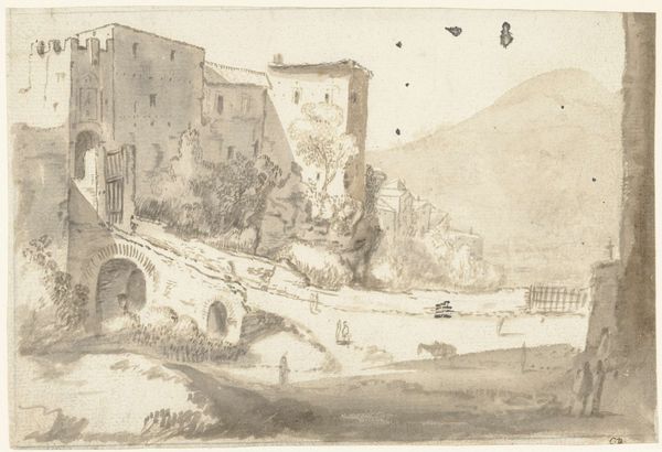 Editor: So, here we have "Castello Bomarzo," a cityscape drawing from 1625 by Bartholomeus Breenbergh, using ink on paper. It gives me a sense of remoteness and perhaps even loneliness; the stark castle contrasts with the open landscape. What do you see in this piece? Curator: The desolation you sense likely reflects a broader artistic and political trend of the era. This drawing wasn’t just about capturing a pretty scene. Think about the role of landscape art in the 17th century. Patronage shifted from religious institutions to wealthy individuals who commissioned works that depicted their power and status, often through idealized landscapes. How does this seemingly simple drawing participate in that? Editor: I see. So, by depicting a rather formidable and isolated castle, Breenbergh might be alluding to the owner's dominion and power. The strategic positioning atop the hill… It is a demonstration of control. Curator: Precisely. But there's more. Notice the relatively small figures making their way up to the castle. What does that choice achieve in terms of how we, as viewers, understand the work and the symbolic implications around the "public role of art"? Editor: They're dwarfed by the castle's scale and imposing stature. They are being subjected by it? Or being overseen by it? Curator: Exactly! And think about where a work like this might be displayed—in the home of someone with the economic and cultural capital to enjoy the work of artists like Breenbergh. How does knowing that context inform how the piece participates in its world? Editor: It really shifts my perspective, knowing how the art was being presented and to whom. It adds so much more meaning! Thank you for expanding my vision on this art piece.