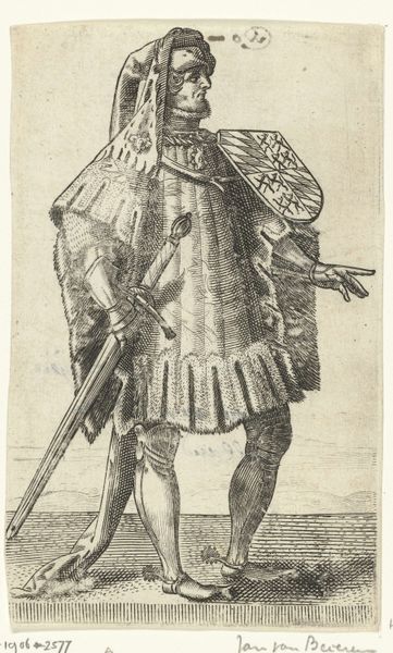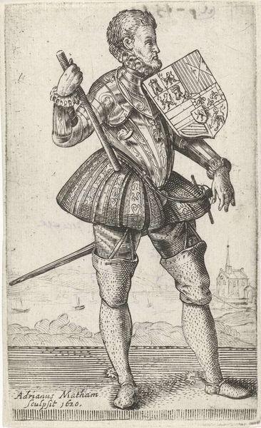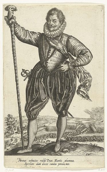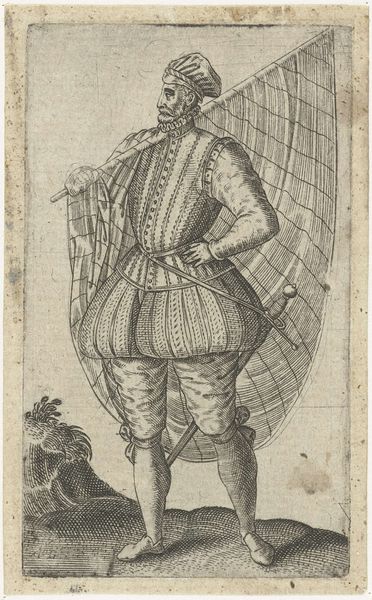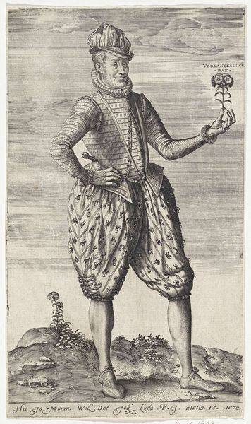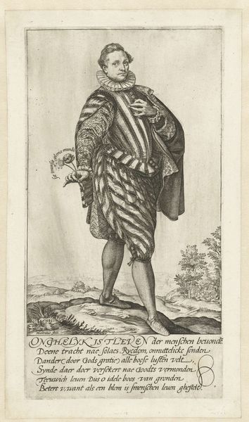 Curator: Standing before us is a detailed drawing titled "Vaandrig," created by Hendrick Goltzius between 1580 and 1584. It is held here at the Rijksmuseum. What strikes you about this particular piece? Editor: Immediately, the figure exudes confidence, almost arrogance. His posture, that flamboyant clothing, even the way he casually drapes the flag over his shoulder. It screams of privilege and status. Curator: It is indeed a study in status. The "vaandrig," or ensign, was a junior officer responsible for carrying the company's flag. This role, while significant, was often held by younger nobles or those seeking to climb the military or social ladder. Goltzius, quite deliberately, used these figures in order to explore contemporary debates around Dutch nationalism and identity. Editor: So the flag isn't just an accessory; it is actually part of his identity. Thinking symbolically, it's interesting how he bears it so nonchalantly, which feels either respectful, implying effortless power, or rather arrogant, and suggestive of ownership? Curator: An interesting contrast. The text beneath certainly alludes to themes of courtship, power dynamics and personal freedom within the bounds of courtly love, possibly even referencing specific societal figures. What do you take from that? Editor: Well, considering it would have originally circulated amongst print collectors and art lovers, I wonder how important the idea of image making itself would have been to viewers at the time? It is easy for us to see the politics of symbolism here, the arrogance of power or nascent Dutch pride, but that final couplet reads also as a motto: in order to "wet them" we must make art (de wet them). Perhaps it has wider-reaching ambitions. Curator: Precisely. The image speaks not just of military might or aristocratic bearing, but about broader societal values too. Editor: Right, now that I see it, I also see those aspirations Goltzius maybe implies. Fascinating how a simple drawing can carry so many layers. Curator: A testament to Goltzius' artistry and the rich visual language of the period, and the questions this era left behind that linger in our interpretation of Dutch society now.