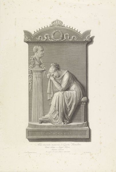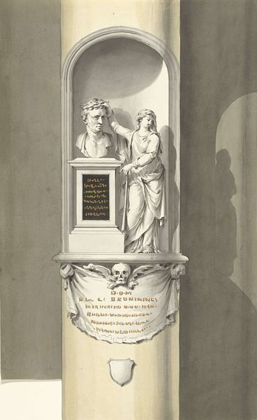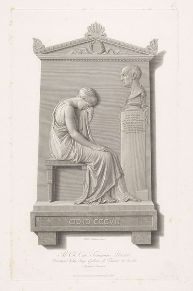 Curator: This work certainly strikes a somber chord, doesn't it? A Neoclassical monument rendered in pencil and graphite, emanating grief. Editor: Indeed. The desaturated palette contributes significantly to that feeling. It's almost ghostly. Tell me more about the context here. Curator: What we're observing is the "Grafmonument van senator Giovanni Falier," or Grave monument of Senator Giovanni Falier. This drawing by Pietro Bonato, created between 1808 and 1822, depicts a memorial design featuring Falier’s bust and a mourning figure. Its severe and formal language mirrors Neoclassical ideals then ascendant. Editor: The image of the woman weeping is powerful. What are the classical precedents and resonances of such iconography? It evokes a Pieta. Curator: That parallel holds. Consider, for instance, the conventional Roman gesture of grief—covering the face. It signals not only profound sorrow but also hints at veiled, interior worlds. Note too how Bonato's work captures more than a single instance of sadness; it encapsulates a period, expressing the tenor of loss during post-Napoleonic social shifts in Venice. Editor: Are there layers of meaning, particularly considering Venice's political climate during that era? Were commemorative monuments like these invested with political messaging or coded references? Curator: Certainly. After the fall of the Venetian Republic, these forms of remembrance provided some social stability, channeling personal bereavement to something of social importance. A figure like Falier becomes representative beyond individual identity, subtly implying continuity and fortitude in times marked by enormous upheavals. Editor: So, it's less about just personal mourning, more about upholding memory to define and preserve what endures after massive societal changes? Curator: Precisely. Herein lays the brilliance: drawing the focus not on just the absence created by the loss, but on what needs active, enduring recognition in face of these gaps and ruins. Editor: The stoicism conveyed is so interesting. We are looking at sadness represented with control—grief transformed to a symbol with clear cultural messages. Curator: That captures the essence precisely, doesn't it? It showcases the complex intersection of emotional restraint and communal meaning within early 19th-century society, viewed via Bonato’s drawing of this fascinating memorial.
