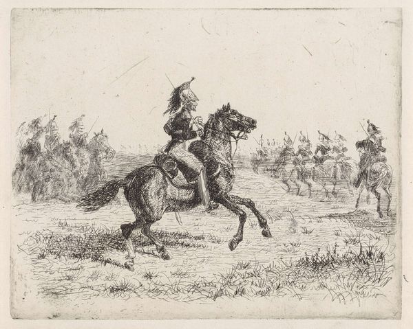 Cornelis Albertus Johannes Schermer created this print of a uniformed rider on horseback, a window into 19th-century military imagery. Notice how the rider is viewed from behind, a motif that has haunted art across centuries. The Rückenfigur, as it is known, invites us to project ourselves into the scene, sharing the soldier's unknown destiny. This pose echoes through Caspar David Friedrich's landscapes and reappears even in modern cinema, each time evoking contemplation on the human condition. The horse itself, rearing slightly, is a potent symbol of power and vitality, reminiscent of equestrian statues of emperors, though here diminished. We can sense the psychological tension between control and wildness, the rider holding the reins of his spirited steed. This push and pull resonates deeply, reminding us that symbols evolve, yet their primal roots remain.