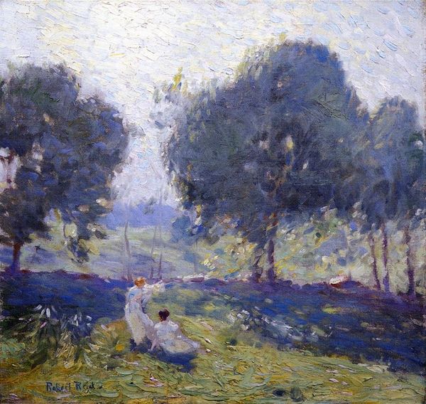 Curator: Maurice Denis' "Dans la Forêt," painted in 1898, it’s an enchanting glimpse into an intimate moment in nature. Editor: It certainly exudes an ethereal quality, almost as if time stands still amidst the trees, like some sort of secret meeting of nymphs. The figures are obscured just enough, draped in fabrics of indeterminate shape. Curator: I am transported back to my childhood every time I see it; the summers of lounging on the forest floor with friends with sunlight trickling between leaves, trying to capture fireflies... There's a deliberate flatness, right? It emphasizes the surface of the painting itself. You see it's built from many small spots and blobs of color; impasto laid out quickly and simply with the palette knife. The means of production are readily legible. Editor: Precisely! Look how the paint application almost deconstructs form, and how the material processes form not only the overall style of the artwork, but also what this group of leisure is actually doing. And while on this topic of "material," consider how the artist may want you to focus less on their lived experiences of sitting around talking with one another, but instead more on how this intimate relationship between people and materials of everyday use can still bring pleasure through its own means! Curator: It reminds me a little of a stage set, the figures positioned almost theatrically amidst the upright trees. In some ways it doesn't feel like realism to me, as much as Denis capturing a collective sentiment of wistful dreams. It also looks like they didn't carry that blanket or quilt that they're seated on too far at all, otherwise, there is just no narrative on it for anyone looking through the artist's memory. Editor: But do you not see the very labor in the way of producing even simple leisure, which is represented in these simple quilts, costumes, bonnets? Those material objects have had their history extracted by means of production and distribution. That's something real worth pondering, yes? The materiality that these post-impressionist used shows just how deeply entrenched with both personal feeling but socio-economic process! Curator: That’s something I hadn't fully considered before...thank you for illuminating this. The piece definitely offers a meditative view into both human interactions and manufactured material and mass production, it captures both simplicity and complexity with its impressionistic texture and palette. Editor: Thank you too. Yes, perhaps "Dans la Forêt" challenges our perspectives beyond a purely subjective appreciation.
