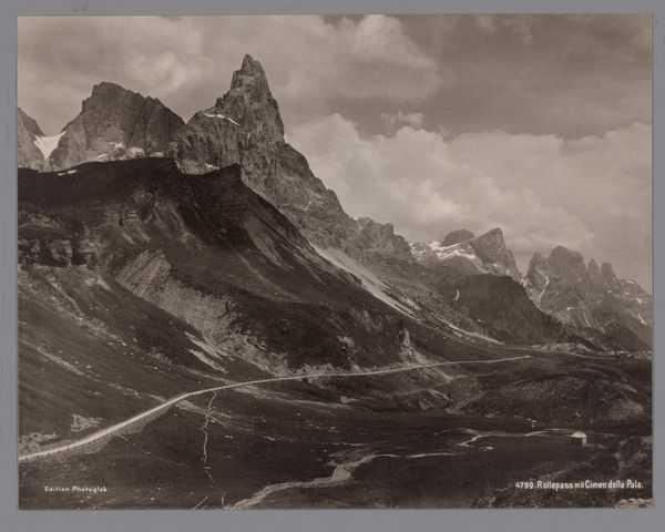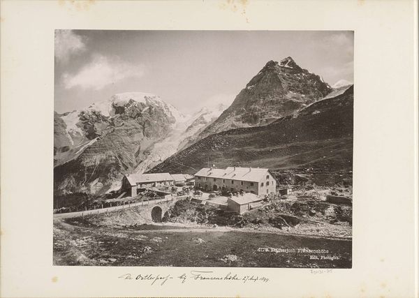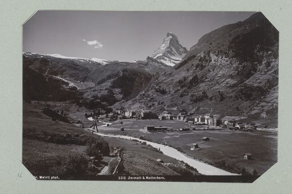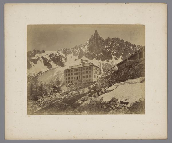 Editor: This albumen print, "Hotel Schwarzsee in Zermatt at the Foot of the Matterhorn," dates roughly between 1870 and 1930 and is attributed to an anonymous photographer. There's a stark stillness to the scene, almost otherworldly. What draws your eye when you look at this image? Curator: The prominent placement of the hotel juxtaposed with the Matterhorn speaks volumes. Consider the period—photography was still developing, and capturing such a landscape was technically demanding. The hotel symbolizes humanity's attempt to not just coexist but also to dominate nature, framing it for consumption and leisure. Does the severe symmetry of the hotel facade suggest a deliberate attempt to control the landscape's wildness? Editor: That’s interesting. I was initially focused on the Matterhorn as this symbol of untamed nature. But the hotel does represent a very human imposition. Curator: Indeed. The Matterhorn, often interpreted as a symbol of strength and resilience, here serves as a backdrop to this edifice of human comfort. It hints at a broader cultural narrative about our relationship with the natural world—the sublime rendered accessible, even commodified. The stark lighting and the choice to capture the image head-on intensifies the visual contrast. Does the image evoke feelings of wonder or unease? Editor: A bit of both, I think. There's something almost clinical about the hotel, yet the Matterhorn is undeniably awe-inspiring. The path leading from the foreground feels almost… staged. Curator: That "staged" quality further reinforces the human desire for order. The path suggests accessibility, a carefully curated experience of nature. Think of the symbolic power associated with mountains in the Romantic era versus the developing tourist industry; one valued awe and transcendence while the other focused on the experiential value. Editor: So, the image becomes this complex interplay between nature and our manipulation of it? Curator: Precisely! The photograph encapsulates a turning point—a shift from experiencing nature as a spiritual force to packaging it as a consumable commodity. It reveals much about evolving cultural values. Editor: I never thought about landscape photography in terms of cultural commentary like that! Thanks!