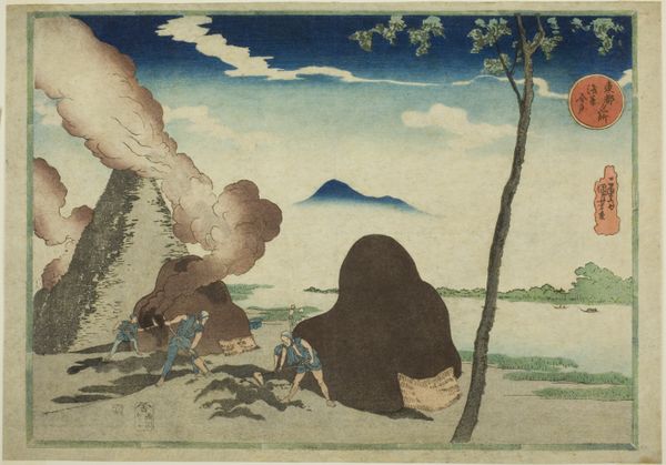 Curator: Ah, "Asakusa Imado," a woodblock print by Utagawa Kuniyoshi, dating from around 1830 to 1850. You can find this atmospheric print in the Metropolitan Museum of Art. Editor: Immediately, I'm drawn to the contrast. You've got this towering plume of smoke practically eclipsing one side, then this solitary, slender tree trying to balance it on the other. It feels like a landscape in mid-transformation, chaotic and serene all at once. Curator: That tension is key. This work, like much Ukiyo-e, provides a glimpse into a specific locale while commenting on the changing social fabric. The Asakusa district was transforming rapidly in the Edo period. These figures appear to be laborers involved in brickmaking. Editor: Right. There's something almost primordial about it, like humans wrestling creation itself into shape. And that towering smoke... it's gorgeous! But menacing. It overwhelms those little guys chipping away at the base. I can't help but think of our own relentless urban sprawl. Curator: Absolutely. We often overlook how these images reflect early industrial processes, the creation of Meibutsu, special products associated with different areas and their local economies. The resulting materials would then circulate across ever-expanding networks of commerce and culture. Here we also see Asakusa's commercial expansion encroaching on natural spaces and a sense of almost celebratory destruction. Editor: So it's this moment caught between traditional ways and progress, a kind of visual haiku of industry... but I'm also thinking of those wispy, nearly dreamlike, mountains fading in the background. It reminds me, things eventually settle or fade away with time... the frantic brickmaking will someday be its own antique. Curator: And Kuniyoshi certainly ensures that those mountains are indeed felt if not distinctly seen; that tension of fleeting presence mirrors our perception of this transitional moment that could then be endlessly reproduced as images, such as this, circulated widely throughout Edo period Japan. Editor: I see now—more than a pretty landscape, it's a history pressed onto paper. Quite clever of Kuniyoshi! Curator: Precisely. So much information, insight, and perspective embedded into one deceptively simple scene. Editor: Well, I’m off to contemplate smoke plumes and creeping industrialization! Thank you for the insight!