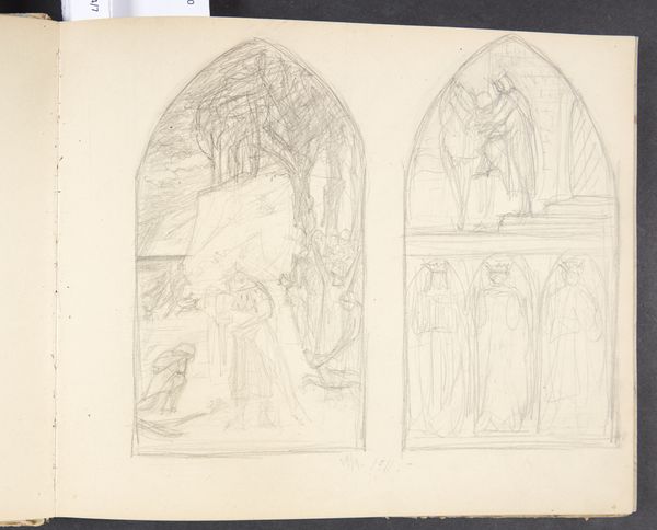 Editor: This is Agnes Slott-Møller's pencil sketch from 1910, "Skitse til 'Fædrelandets Vaar'", which translates to "Sketch for 'Springtime of the Fatherland.'" It’s on paper, and feels quite… fragile, almost tentative, yet the composition suggests a grand scale. What strikes you about it? Curator: I'm drawn to the central figures clustered around what appears to be a baptismal font or a communal vessel. Given the title, "Springtime of the Fatherland," consider how this scene evokes themes of national identity and renewal. Who is being reborn in this "spring"? Editor: That’s interesting, I was so focused on the figures. So you see this as representing rebirth for a nation, not necessarily just individuals? Curator: Exactly. Remember this was sketched during a period of intense national romanticism across Europe. What symbols are at play? What does "fatherland" even mean here? It's not just a geographic space but also a socially constructed entity steeped in gendered and often exclusionary ideals. Editor: Exclusionary? In what way? Curator: Think about who is included in this vision of the "fatherland," and who might be marginalized. Does this image reinforce a homogenous idea of national identity, potentially erasing diverse voices or experiences? It would be very interesting to study Slott-Møller's larger body of work through an intersectional lens, seeing how her depictions either challenge or uphold existing power structures. Who has access to that “springtime"? Editor: That adds such a critical layer to viewing this. I originally just saw a historical drawing, but it seems charged with social commentary about identity and belonging. Curator: Exactly, viewing this sketch provides an opportunity to dissect historical and social undertones within it, broadening it from mere art appreciation to an important moment of contemplation.