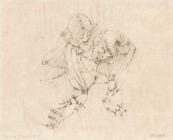 Curator: Here we have Thomas Stothard's "Two Kneeling Figures," held in the Tate Collections. Its dimensions are quite intimate, just 62 by 64 millimeters. Editor: There's a fragility to it, a sketch of something fleeting. The lines are so delicate. What material did Stothard use? Curator: The medium is described simply as "ink on paper," suggesting a directness of process. Editor: Ink lends itself to spontaneity. I wonder if the social climate influenced Stothard's choice, perhaps an urge to break from formal academic practices. Curator: The composition, even in its minimalism, is carefully considered. The figures are intertwined, creating a unified form. Editor: Still, it feels unfinished, raw. It reminds us that art is not just about the final product but the labour and experimentation involved in the process. Curator: Indeed, and perhaps its incompleteness invites the viewer to participate, to fill in the gaps. Editor: I agree. It allows us to appreciate the artist's hand and how it relates to societal shifts. Curator: A wonderful perspective, emphasizing its engagement with process. Editor: Thank you. It’s been enlightening to discuss this small but potent piece with you.
