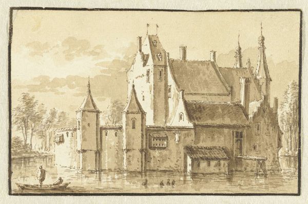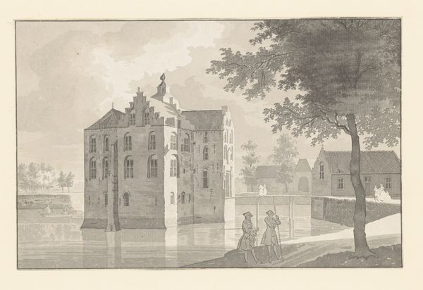 Curator: Here we have Hendrik Tavenier’s drawing, “Gezicht op het Slot Assumburg bij Heemskerk,” placing us before the Assumburg Castle, though created around 1750. The artist captured the fortress with pen. Editor: The somber monochrome immediately establishes an atmosphere of bygone grandeur. It's stark, almost cold, and it evokes a sense of the past bearing down on the present, I'm assuming that Tavenier wasn't there in 1640 as per the artwork name... Curator: A fitting observation. And yes, the date etched within the frame indicates 1640, but this work isn't contemporary with that year. It appears to be Tavenier’s 18th-century interpretation of a slightly earlier depiction, reflecting a renewed interest in the Dutch Golden Age. One thing of note is that this is very unlikely what it looked like back then given later changes and construction. So his perspective gives it a double filter. Editor: So we are seeing a romanticized and historically distanced version. It brings up so many questions. Was it commissioned to create a kind of visual national pride or to invoke certain power structures of the period? Curator: That’s where context becomes crucial. By the mid-18th century, the Dutch Republic's "Golden Age" was firmly in the past. Images of prominent, impressive structures from the period often served to recall that era of power, stability, and cultural flourishing. Editor: It also makes me consider how these representations solidify particular historical narratives. Does highlighting castles like this inherently center stories of the wealthy and powerful while marginalizing the experiences of others in that era? What does this say about which histories get preserved and celebrated? Curator: It speaks to the deliberate crafting of national identity and historical memory through art. Patrons, artists, and institutions chose what aspects of the past to emphasize. "Gezicht op het Slot Assumburg" demonstrates this selective highlighting—a fascinating and subtle form of political rhetoric. Editor: Looking at it now with fresh eyes, I see not just an architectural depiction but a tableau loaded with meaning, a complex intersection of history, memory, and perhaps a little... nostalgia. It pushes us to think critically about who shaped these narratives and why. Curator: Exactly. These echoes of the past resonate into our present, prompting us to confront the politics inherent in how history is visually and culturally preserved. I'm grateful we had this moment to dwell on that notion.