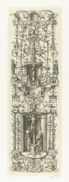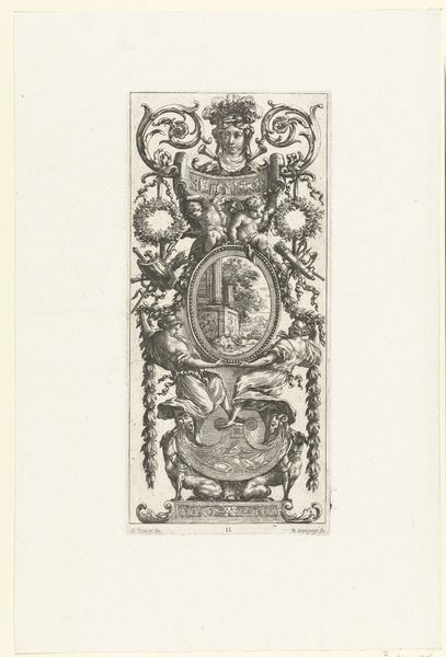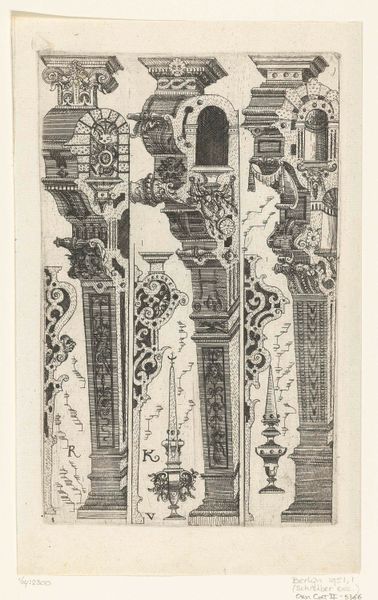 Editor: Here we have a print called "Term eindigend in vrouw met druiventrossen," which translates to something like “pillar ending in a woman with grapes,” created in 1622 using etching. Looking at it, I'm struck by the almost architectural quality. The starkness of the black and white against the complex designs creates a really intriguing contrast. What do you make of this piece? Curator: You’re right, it does feel architectural, almost like a blueprint for a fantastical building. The woman emerging from the pillar feels both powerful and constrained, doesn't she? The grapes suggest abundance and fertility, but also, perhaps, a sort of entrapment. I wonder, did this artist ever imagine his designs in grand estates or humble homes? Did they dream of their designs gracing palatial homes? This begs a greater question: do ideas belong more to the creator, or to the appreciator? Editor: Entrapment… that's interesting. I was so focused on the classical elements and decorative details I didn't consider that reading. Curator: It's easy to get lost in the details! Look closer – those grapes aren't just a symbol; they’re physically weighing her down, part of her very structure. Now, isn’t there an irony there? That which symbolizes life is now her prison. Editor: Wow, I hadn’t thought about it that way! This has been very illuminating and gives me so much to consider, it goes well beyond the visual ornamentation of the piece itself. Curator: Precisely, and hopefully opens a door in the labyrinth of your own thinking on similar artworks, perhaps in ways that are also constricting. I certainly look forward to revisiting my original assumptions next time I return.