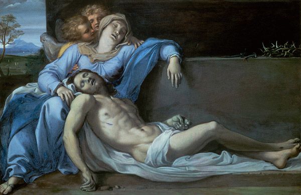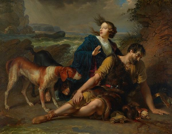 Editor: So, here we have *Diana and Endymion*, an oil painting, probably Baroque in style, by Sebastiano Ricci. I’m immediately struck by the dreamy atmosphere and the contrast between the sleeping figure and the watchful goddess. It’s quite… intimate, wouldn’t you say? What catches your eye? Curator: Oh, absolutely intimate, in that dreamy Baroque way! For me, it’s the dogs. Those dogs are witnessing something eternal, something unfolding outside of time, like only animals can. Notice how Diana almost blends with the cloud she sits on? That lightness is also in her hand gesture - a subtle refusal, but of what? Is it immortality she withholds? Or a blessing? Editor: A blessing, perhaps disguised as refusal? That's a neat way of thinking about it. I hadn’t considered the cloud-like quality. So you’re reading a lot into her hand… Curator: The hand, the hounds… Ricci’s Baroque drama pulses beneath a seemingly placid surface. It's almost a voyeuristic vision, don’t you think? We are invited to witness something tender, secretive… Do you think Ricci meant it to feel intrusive? Or just human? Editor: Hmmm… intrusive. I hadn’t thought of that, but now I’m wondering about the cherubs hovering in the background. Are they witnesses, too? I was so focused on the human(ish) elements, I completely missed their role in the drama. Curator: Precisely! They are a painted echo - or perhaps a mirror? The questions this raises really underscores, for me, why Ricci is such a master. He gives us so much, without giving it *all* away. It leaves room for our hearts. Editor: So, the painting invites us to become another set of voyeurs, to project ourselves and feel… invited… or even *un*invited. Wow. I’m seeing it in a totally different light. Curator: Yes, and the best art always seems to hold new insights doesn't it? It waits patiently, while we catch up.