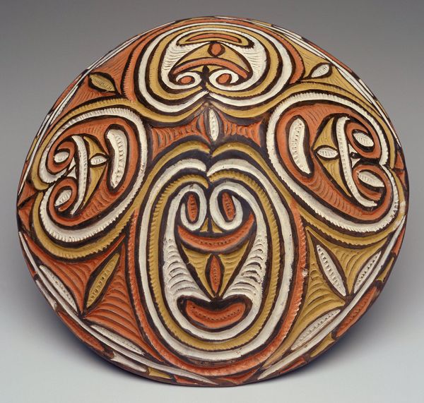 Curator: Here we have a Gope Board, dating to around the 20th century, now housed at the Minneapolis Institute of Art. These boards are traditionally created by the people of the Papuan Gulf, and this one is crafted from wood, featuring intricate carvings and relief work. Editor: Whoa, I get an immediate, primal jolt from it. The stark geometric shapes and that symmetrical face in the center—it's mesmerizing and kind of…intimidating, like some powerful spirit staring right through you. I love the limited color palette, the earthy reds, whites and blacks; the shapes appear to float. What can you tell me about its purpose? Curator: Gope boards served multiple functions. They were often kept in men’s communal houses and were believed to embody and channel the spirits of ancestors, especially those lost at sea. They acted as intermediaries between the living and the dead. The specific geometric patterns, those lovely, rhythmic chevrons, and the faces are thought to hold particular significance tied to clan identity and mythical narratives. Editor: So it's like a family crest, but infused with spiritual energy, and honoring their waterlogged ancestors? Makes that intensity I felt earlier even more interesting. Do we know how the boards are constructed, what that process looks like? Curator: Absolutely. The boards are typically carved from mangrove wood, chosen for its durability. The process of carving and painting would involve ritual purification and invocations. Traditional pigments, derived from natural materials, would be applied, creating a visual language deeply intertwined with the community's worldview. It’s important to acknowledge that colonial dynamics impacted Papuan artistic expression, including, and particularly during, the time period of its making. Editor: Wow, picturing that creation ritual— it sounds powerful. Knowing the intention behind the geometric and face carvings adds another layer; this isn’t just a carving, it's a vessel of stories and a bridge across generations. I'll admit, my perspective coming into this, the "primal" vibe, might have overlooked those crucial historical layers. Thanks for bringing that richness. Curator: It's a privilege to share a perspective which foregrounds the intertwined cultural significance of such artwork. Approaching Indigenous art demands an awareness of colonial impact and the need to engage with narratives from the communities themselves. Editor: Well, this visit definitely turned my initial, instinctive response into something far more layered. Next time I will come more prepared to look into all angles of the works. Curator: Indeed, these encounters enrich us with insights of history.