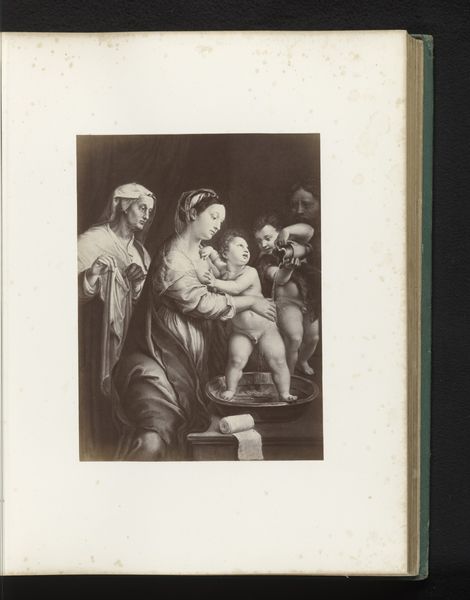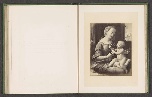 Editor: This photograph, a gelatin silver print dating from before 1875, captures Vincenzo Tamagni’s painting "Maria with Christ Child and John the Baptist." The photograph’s sepia tones give it such a nostalgic feel. How do you interpret this reproduction of a Renaissance painting through a photographic lens? Curator: It's fascinating how photography, a relatively new medium at the time, seeks to capture and translate the visual language of the Renaissance. Think about what symbols endure here: the Madonna and child, and the infant Saint John. This composition echoes centuries of religious iconography, these images would have a heavy weight in people’s minds and carry connotations. Do you notice how those symbols might shift slightly when reproduced photographically? Editor: I guess I see it still has that feeling of reverence, but maybe made more… accessible? Less about pure divinity and a little more human? Curator: Precisely. Photography, even of religious subjects, had a grounding effect. Consider how the shift from paint to photography might change the viewer’s relationship with these holy figures. The availability, reproducibility... does it amplify or dilute the original intention? Editor: That’s interesting! I never thought about how the medium itself affects the message. The photo flattens the painting, maybe creating a sense of distance even as it makes the artwork more accessible. Curator: Yes! The layers of representation--painting, then photograph--create new meanings that circulate through visual culture. The cultural memory held in the image changes form and context. What remains, and what shifts? Editor: It really makes you think about the long life an image can have, and how each stage transforms it a little. Curator: Indeed. Seeing how a Renaissance theme gets repackaged in the 19th century helps us appreciate the complex story these symbols continue to tell.