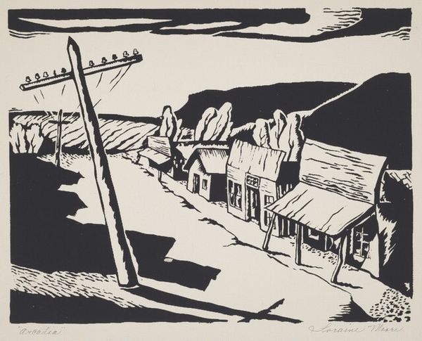 Editor: So, this is "Farm with Telephone Pole," a 1931 woodcut print by Werner Drewes. I'm immediately struck by how stark it is—the high contrast really emphasizes the geometric forms, especially the telephone pole jutting into the landscape. What's your take on this work? Curator: It’s fascinating to consider this piece through the lens of technological advancement impacting rural life. Think about the context: 1931, rural America grappling with the Depression. This woodcut isn't just a landscape; it's a commentary on the changing face of that landscape. Does that telephone pole represent progress, connection, or perhaps an intrusion, a disruption of a traditional way of life? What feelings are evoked in the sharp juxtaposition of organic forms against those man-made geometric shapes? Editor: I hadn't considered the Depression angle. The pole now seems like a very forceful symbol of modernity. Does the woodcut medium itself inform that contrast, being more of a traditional, almost agricultural, medium? Curator: Exactly. The use of woodcut, an older printmaking technique, to depict such a modern symbol creates a deliberate tension. The bold, graphic nature of the medium further amplifies the visual statement. Consider who benefits from this technological "progress" and at what cost? Were farmers given access, or was their lifestyle being monitored? What do the stark contrasts say about power structures? Editor: That adds another layer – it’s not a simple celebration of technology. Maybe it’s a critique of the power dynamics inherent in modernization? I initially only thought about composition. Curator: And isn't that the beauty of art? It can be visually compelling but also act as a mirror reflecting societal anxieties and inequalities. What have you gained from analysing "Farm with Telephone Pole?" Editor: It definitely challenged my first impression and revealed how much context shapes our interpretation. I see a far more politically charged piece now, making me consider the narrative the artist constructs. Curator: Precisely! A successful encounter with art invites self-reflection and an interrogation of the world around us.