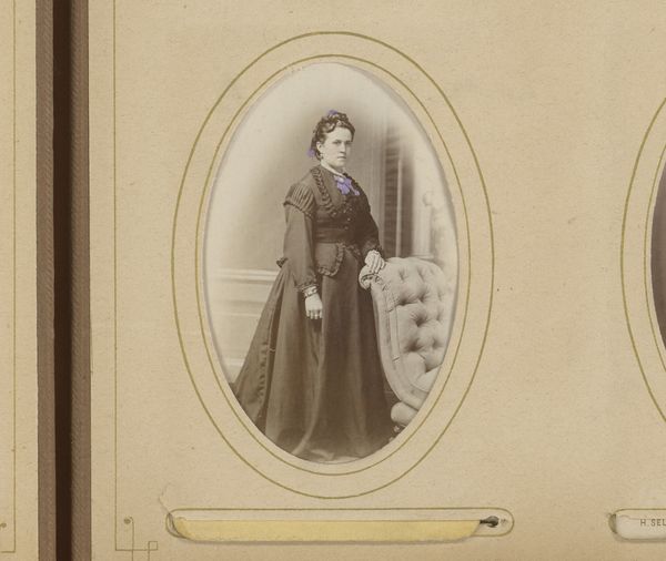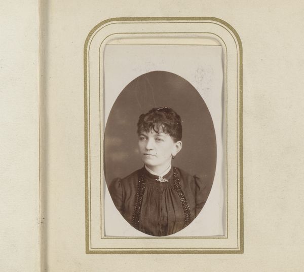 Curator: Ah, yes, "Portret van een staande vrouw met waaier in de hand" by Theodor Wenzel, a striking photographic portrait likely captured between 1880 and 1920. Editor: My immediate impression is one of understated elegance. The sepia tones and the woman's simple dress lend it a quiet, almost melancholic feel. Curator: I agree. Considering the era, this image probably reflects the emerging role of women in society. Posed but assertive, holding a fan, hinting at a subtle, coded communication. What social strata do you think she belonged to? The clothing appears to have status value, although without flamboyance. Editor: Absolutely. The formality of her pose and the careful arrangement of elements within the oval frame highlight structure. The texture of her dress, set against the smoothness of her skin creates a dynamic tension. I can observe great value within this composition by only using its visuality and by omitting its social implications. Curator: Yes, but can we really detach from the social implications? Her outfit, though seemingly simple, would be a deliberate statement of societal and gender status. It is this balance, a sense of poised restriction within this representation that is so telling. Her demure countenance could conceal any number of subversions and social position. Editor: I appreciate the historical reading, but let's consider how the light falls across her face, drawing our eye upwards, creating a hierarchy of importance in the image itself. We can think of it as pure semiotics, of signifiers being strategically arranged and their significance. This goes well beyond a simple statement of gender or social standing. Curator: But can this artistic "choice" stand devoid of these contextual forces, though? Who controlled the setting, their vision, the gaze itself, is deeply rooted within society and politics. To interpret outside that risks neutralizing historical evidence, silencing critical voices, don't you agree? Editor: Maybe there is some truth to it, yet by decontextualizing it, a certain formal value can be appreciated, if one understands structure. Curator: Well, on this occasion I might admit to enjoying the photograph through your filter as well, to notice how its historical essence shapes and impacts those abstract principles you highlight so clearly! Editor: Then perhaps there can be an alignment between structure and context!