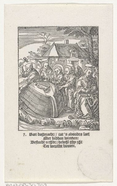 Christoffel van Sichem II created this woodcut titled "Christuskind bouwt een schip," sometime between the late 16th and mid-17th century. During this time, the Dutch Republic was asserting its maritime power, and this piece reflects the intersection of religious narratives with the burgeoning mercantile culture. We see the infant Christ actively engaged in shipbuilding, assisted by angels with a variety of tools. This depiction departs from traditional representations of the Christ Child, who is usually shown in passive, devotional poses. The scene is busy, industrious. It connects spiritual purpose with the very earthly act of constructing a vessel. Consider the implications of portraying Jesus as a builder. This was a period marked by religious and political upheaval, with the rise of Protestantism challenging the Catholic Church’s dominance. By showing Christ involved in physical labor, Van Sichem perhaps emphasizes a more accessible, humanized religious figure, aligning with the Protestant work ethic. This print invites us to contemplate the relationship between faith, labor, and the tangible world, at a time of immense social change.