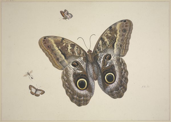 Pieter Holsteijn made this image of a butterfly with watercolor on paper in the 17th century. Holsteijn employed traditional techniques and materials. The paper support offers a smooth, absorbent surface, which allowed for fine detail. The careful application of watercolor suggests both scientific accuracy and aesthetic sensibility, typical of the period's natural history illustrations. The artwork's social significance lies in the context of the burgeoning scientific inquiry and the interest in the natural world. It reflects a culture of meticulous observation and documentation. The artist engages with traditions of botanical and zoological illustration, blending craft with scientific pursuit. Holsteijn's delicate rendering elevates the butterfly beyond mere documentation, inviting contemplation on the beauty and intricacy of the natural world. It is a reminder that even the most unassuming materials, when skillfully manipulated, can bridge the divide between art and science.