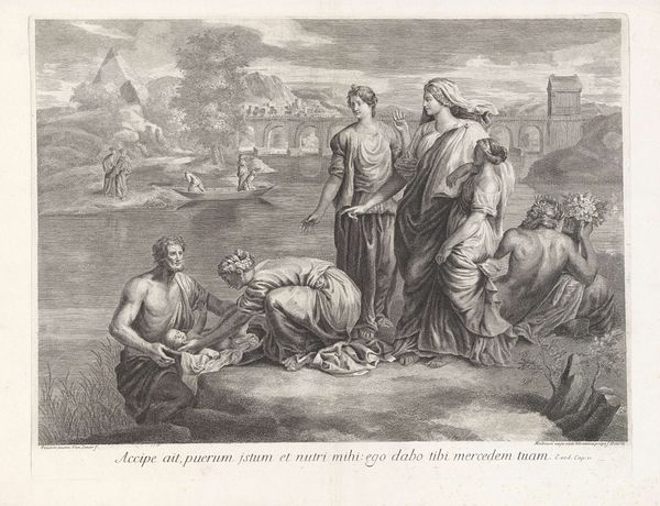 Curator: Let's discuss this engraving from the 1730s after a painting by Silvestro Manaigo, titled "Joseph being sold into slavery by his brothers, who sit around a well dividing up the coins." It’s currently part of the Metropolitan Museum’s collection. Editor: Oh, wow. My first thought? The energy here is intense. You’ve got the almost casual cruelty of the brothers counting their money while Joseph is… well, less than thrilled, down by the well. Darkly fascinating. Curator: Precisely. The scene, taken from Genesis, is rife with betrayal and the brutal realities of power dynamics. Note the body language of the brothers versus Joseph. It is not merely about fratricide, it is about resources and power relations that traverse families and societal structures. Editor: Right, you’ve got that contrast with the callousness around the money and this feeling of deep despair with Joseph, and he looks almost like he is actively fighting to go toward this awful fate that's being designed for him. Did engravings like this circulate widely at the time? I mean, could people easily get an image so filled with complex emotional narratives? Curator: Definitely. Prints made these biblical scenes accessible to a broader audience, fostering discussion and moral introspection. Think about the rise of capitalism during that era and the role that scripture played in social imaginaries around family. Here we see those family units violently restructured through money. Editor: So it becomes less about personal piety and more about social commentary, like maybe how easy it is to justify awful acts if there’s a monetary reward, if the incentive to betray others has a concrete profit? Curator: Precisely! And we see the commodification of a human life presented with Baroque-style dynamism, complete with a very literal accounting of profit over a ruined life. This isn’t just religious art; it’s a meditation on ethical quandaries through the lens of faith, family, and economics. Editor: It’s unnerving how resonant the image remains. I think there is that really modern twist of turning your back and walking away from family… Curator: Exactly. It’s about more than the individual sin, but how collective greed reshapes social bonds. Editor: I suppose you are right. It lingers because of how clearly it highlights the enduring cost of greed on family. Curator: Yes, exactly! An excellent illustration, no pun intended, of the intersections between art, faith, and economics that speaks to issues that continue to haunt the present.