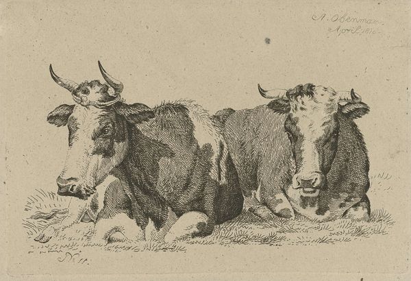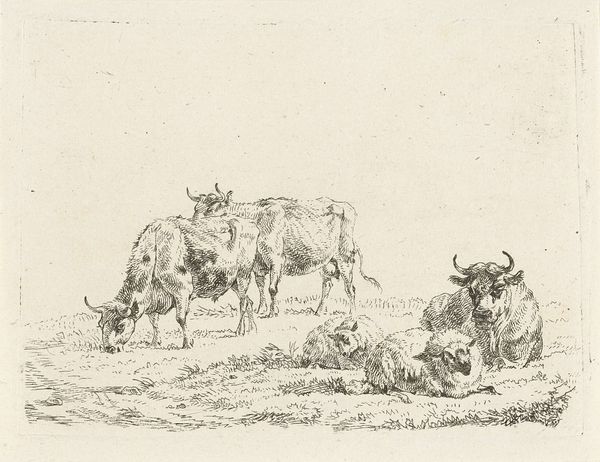 This print of cattle was made with etching by an anonymous artist. Etching involves covering a metal plate with a waxy, acid-resistant substance called a ground, through which the artist scratches an image. The plate is then bathed in acid, which bites into the exposed lines, creating grooves. Ink is applied, filling these grooves, and the surface is wiped clean. Finally, the plate is pressed onto paper, transferring the inked image. The dense hatching and cross-hatching demonstrate the artist’s skill in using the etching needle to create subtle tonal variations and textures. The lines give shape to the animals, capturing the solidity of their forms and the thickness of their fur. As a method of image production, etching emerged in early modern Europe, becoming a means for wider circulation. It could reproduce existing artworks or create novel images, democratizing art by making it more accessible than unique paintings. This print is an example of the industrialized techniques of image-making, where each one is the result of skilled labor.