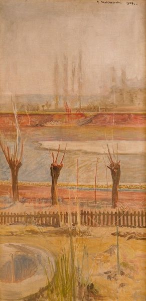 Curator: Mikalojus Konstantinas Ciurlionis created this watercolor, "Scherzo (Sonata of the Sun)," in 1907. It’s an interesting example of the Symbolist landscape. Editor: My first thought is a strange, quiet harmony. The colours are muted, the composition relatively simple. It reminds me of early attempts at color photography, with those slightly surreal greens and yellows. Curator: Ciurlionis saw color and music intrinsically linked. In "Sonata of the Sun", consider the "scherzo," traditionally a lively, playful movement in a symphony. Is that playfulness present here for you? Editor: There's a stillness that contradicts that title somewhat. Look at the repeated vertical elements: the trees, the fence posts. They create a very deliberate rhythm, but one that’s far from frantic. Perhaps, a slowed down, almost meditative version of a scherzo. Curator: Interesting. Note also the bridges: one rendered clearly and one more implied in the composition. The motif of bridges, in Ciurlionis's work, can be understood as a link between earthly and spiritual realms. Editor: Those bridges really draw the eye. One could spend a long time tracing those horizontal lines against all that verticality. Also the materiality… You know, the very looseness of the watercolor is interesting when juxtaposed with the crisp geometric forms and very solid shapes in the middle of the painting. Curator: It could be read as earthly order struggling to contain some more nebulous, transcendental presence. Do you get a sense of place here? It feels at once universal and strangely familiar to me. Editor: I’m not sure "place" is quite the right word. More a… symbolic zone. An idealized, structured landscape more than anywhere that could be mapped or visited. It’s all about suggestion. Curator: Suggestion is key. For me, it's an invocation of cultural memory; how landscapes often become encoded with cultural significance. Editor: It definitely invites contemplation on memory, especially how we organize sensory details, distilling experience down to its most fundamental elements. Curator: Well, on that note, I think we've started to unlock some of this unusual painting's complexities and nuances. Editor: Indeed. Its formal quietness, ultimately, creates a potent symbolic space.