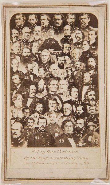 Curator: Here we have “Army and Navy U.S. (composite of 100 photos),” a fascinating composite photograph by C. D. Fredricks and Co. Editor: Wow, it's a sea of serious faces! Gives me the feeling of being watched, almost like a historical jury. Curator: Indeed. The process involves meticulously arranging individual portraits, likely albumen prints, to create this collective representation. The commodification of heroism during and after the Civil War is evident. Editor: It is eerie how the individual merges into a collective identity. Makes you think about the human cost and the industrialization of war, all captured in this tiny rectangle. Curator: The material reality of this photograph speaks volumes about the era's technological advancements and its socio-political landscape. Editor: It's a powerful little monument, isn’t it? The past staring right back at us.