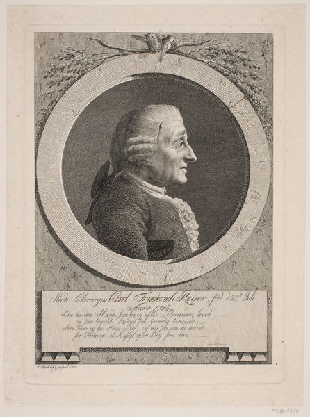 Editor: Here we have "Mgr. Le duc d'Orléans," a print with coloured pencil from 1789 by Louis Philibert Debucourt. It strikes me as a formal portrait, very much in the style of its time. The Duke looks rather imposing within the decorative frame. What stands out to you in this piece? Curator: The placement of this portrait within the decorative elements tells us a lot about the socio-political landscape in France right before the Revolution. It’s not just a depiction of a nobleman, but a carefully constructed public image. Editor: Could you expand on that? What elements point to that reading? Curator: Consider the allegorical scene below the portrait: the inscription tells us it depicts Minerva, representing the Duke’s intelligence. He is being framed, quite literally, as a figure of wisdom and abundance, a worthy leader. Given the unrest bubbling at the time, this kind of visual propaganda was common. It was a way for the aristocracy to assert their legitimacy, but also, I think, reveals their deep anxieties. Do you notice anything about the colors or textures that seem to either confirm or counteract that political messaging? Editor: The colors are actually quite soft, even muted. The lines are delicate rather than bold. That does soften the image a bit. Maybe it’s trying to convey accessibility, not just authority? Curator: Precisely! It suggests a desire to appear benevolent, which says a great deal about the way the aristocracy sought to present themselves. Editor: I never thought about portraiture as such an active political tool. Thanks, that’s a fascinating perspective. Curator: And I hadn't considered how Debucourt's use of color softens the power dynamic here. There’s always more to learn from re-examining these historical narratives!