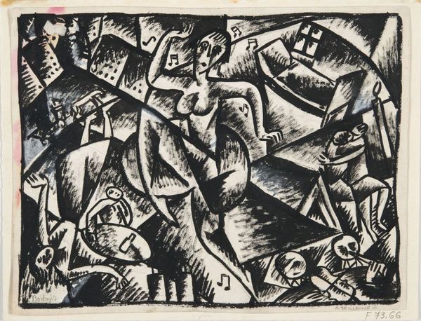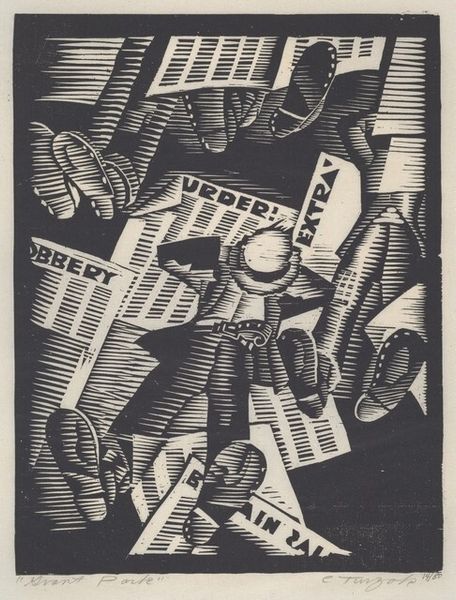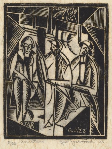 This is an untitled black ink woodcut print of sailboats and houses by George Josimovich, made in 1923. The high contrast between the dark ink and the off-white paper lends the piece a stark, graphic quality, but it's also full of movement. The marks are crisp and deliberate, each line carefully considered to build depth and form. Look at the lower left corner, at the concentric lines suggesting a rise in the ground. They ripple outwards in a way that feels both controlled and organic, almost as if they were created by a geological process. There's something almost architectural about the way Josimovich uses line and shape. The artist creates a sense of space and perspective through simple geometric forms. The sailboats, houses, and even the sky, are all constructed from sharp angles and planes. It makes me think of Cubism, how artists like Picasso and Braque broke down objects into their basic forms to create a new kind of visual language. It’s a conversation across time about how we see and interpret the world around us.