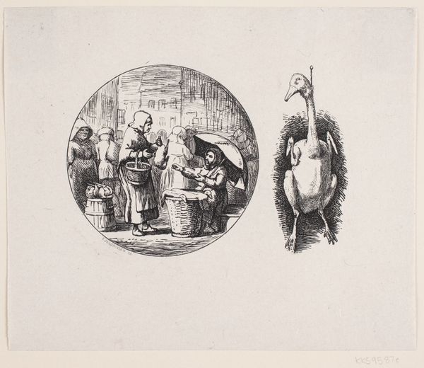 Curator: This is Carl Ploug’s "Illustration til Carl Ploug, 'Kong Harald og Islændingen,'" created between 1870 and 1882. Ploug rendered this narrative scene using ink in a print medium, now held at the SMK. Editor: What strikes me immediately is the high contrast and detail for what appears to be such a small scale work. The composition is surprisingly balanced, considering the narrative complexity. Curator: Indeed. This image served as an illustration, imbuing a specific scene from Carl Ploug’s poem with visual meaning. Understanding Ploug’s own political stances—his pan-Scandinavianism, his Danish nationalism after the 1864 war—helps unlock layers of interpretation in this seemingly simple illustration. The figure of the performing bear takes on symbolic weight when we consider representations of marginalized communities through animalistic figures in media from that era. Editor: But the lines are really compelling, particularly the textures. Notice how Ploug distinguishes between the wooden floor, the furs, the people’s faces, all through masterful hatching and cross-hatching. The details provide tonal variation that is very compelling, leading the eye to the different players. Curator: Precisely. And consider the staging here: Harald, seated above in a throne-like chair. What power dynamics are at play in a scene like this one? The narrative seems to hint at some form of judgment being passed. A reading that is hard to miss today is how disabled persons and animals were instrumentalized and placed for ridicule. Editor: But structurally speaking, even the direction of the floorboards seems to guide us toward Harald, emphasizing his position in the hierarchy of the setting, even if it’s within an ink and print based composition. Curator: Looking at "Illustration til Carl Ploug, 'Kong Harald og Islændingen'" allows us to consider art's function as cultural mirror, one reflecting societal values of both artist and era, prompting critical dialogues around historical representation. Editor: Ultimately, Ploug delivers an artful use of technique to capture both historical atmosphere and psychological depths in "Illustration til Carl Ploug, 'Kong Harald og Islændingen,'" offering us great observation.