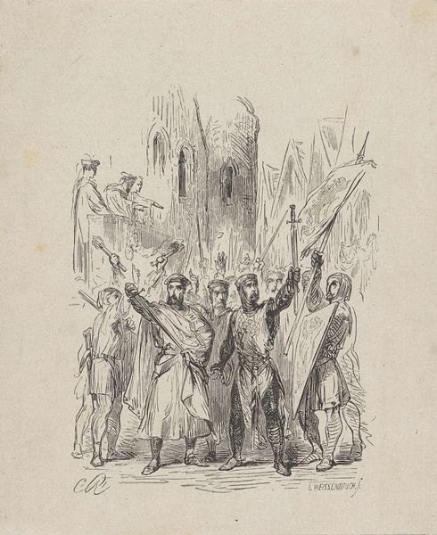 Curator: Let's dive into Isaac Weissenbruch's "Groep ridders," dating from 1836 to 1912, executed in pen and ink. Editor: It's a playful drawing, almost like a cartoon! A band of knights depicted with some humorous detail. I wonder, what’s your reading of this piece, considering its historical context? Curator: What I find compelling is the subversion of the heroic ideal. Knights are traditionally symbols of power, but here, their exaggerated features and slightly absurd postures, especially that character with the smiley-face head, hint at a critique of authority. Considering the time, could this be a commentary on changing social structures and the questioning of established hierarchies? What do you think? Editor: That’s interesting. It never occurred to me. It looks like it could be pointing at the declining relevance of chivalry, with its outmoded ideas. It seems like the figures are caricatures. The most dominant is even smoking a pipe! Curator: Precisely! And how might the choice of pen and ink, typically used for sketches and preliminary studies, influence our understanding? Is this a finished work, or a fleeting commentary? Perhaps Weissenbruch is exploring themes of social change through satire, using humour as a tool for highlighting disparities in the societal constructs? Editor: I see your point! I initially thought of it as something humorous on its face, but when contextualized like this, you can observe an interesting observation regarding societal shifts that’s subtly expressed by the drawing. Curator: Exactly. Weissenbruch gives an otherwise antiquated setting in modernity through humour. He prompts viewers to challenge historical narratives, power dynamics and shifting values in his own particular way. It's these dialogues between past and present that enrich our experience with art. Editor: I agree. Looking at art in the context of broader themes that echo societal tensions really allows a greater appreciation for the meaning layered into an otherwise casual and comedic sketch!