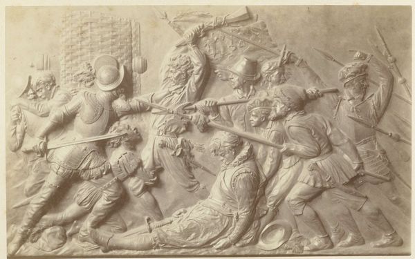 Willem Frederik Vinkenbos created this relief with a scene from the Eighty Years' War sometime in the 19th century. Its monochromatic rendering gives it the aesthetic qualities of a photograph. Yet, it is far from a neutral recording. Instead, it is a stage. The scene is formally divided between those departing by boat on the left and those left behind on the right. In the Eighty Years' War, from 1568 to 1648, the Dutch fought for independence from Spain. The formal symmetry of the artwork underscores the idea that both sides experienced a deep sense of loss. Note how the artist used a high degree of relief to bring the figures forward, creating a sense of drama and immediacy. The linear nature of the waves juxtaposed with the rounded figures creates a contrast. Ultimately, this relief invites contemplation on the universal and enduring themes of conflict, displacement, and the shared human cost of war. It leaves us to ponder the complex interplay between form, content, and historical context.
