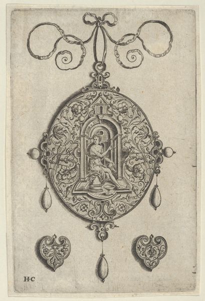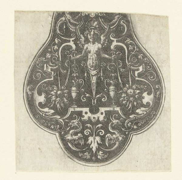 Etienne Delaune made this print, Mercurius, Blazend op een Trompet, sometime in the 16th century. It's an engraving, meaning that the artist would have used a tool called a burin to cut lines into a copper plate, which would then be inked and printed. Engraving like this was painstaking work, requiring years of training to master the control of line needed to create such intricate detail. The image itself—a dense array of figures and decorative elements, all organized within a shield-like form—speaks to the social function of prints at this time. They were often used to disseminate classical motifs and design ideas to a broad audience, and were used for reproduction and distribution. Prints like this one played a crucial role in the development of visual culture, as they made images and patterns accessible to artisans and manufacturers across Europe. The labor involved in their creation was thus leveraged across many other trades, from goldsmithing to furniture making. By understanding the material and social context of this print, we can appreciate its significance not just as a work of art, but as a tool for shaping taste and driving commerce.