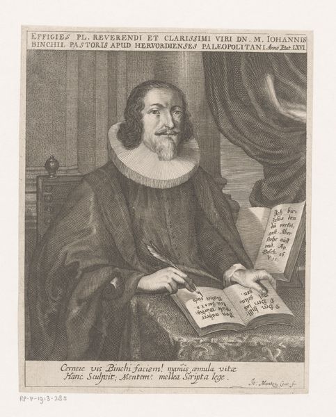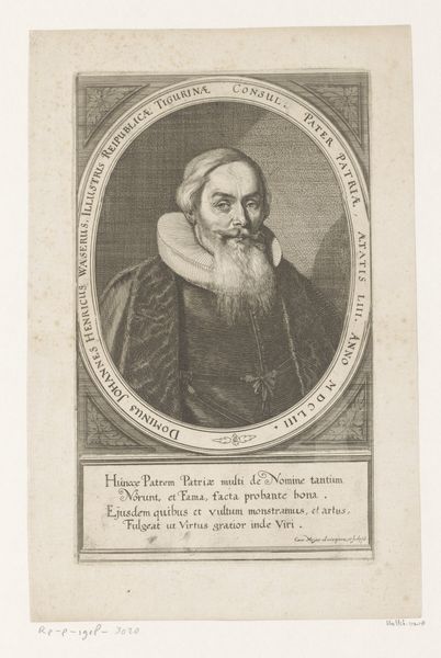 This engraving, "Portret van Balthasar Wille" by Kaspar Schultze, presents us with a study in contrasts, meticulously rendered. Encased in an oval frame of text, Balthasar Wille’s figure dominates the composition, evoking a sense of solemnity. The stark contrast between the dark attire and the bright, almost luminous face draws our eyes to the countenance of Wille, a book in his left hand. Schultze masterfully uses the play of light and shadow to define form, lending a sculptural quality to the figure. Consider how the surrounding text, acting as a frame, both confines and elevates the subject. This tension between constraint and prominence reflects larger philosophical ideas about identity and representation, suggesting that the essence of an individual is both defined by and transcends their social and intellectual context. The engraving becomes a site where meaning is actively constructed and negotiated.