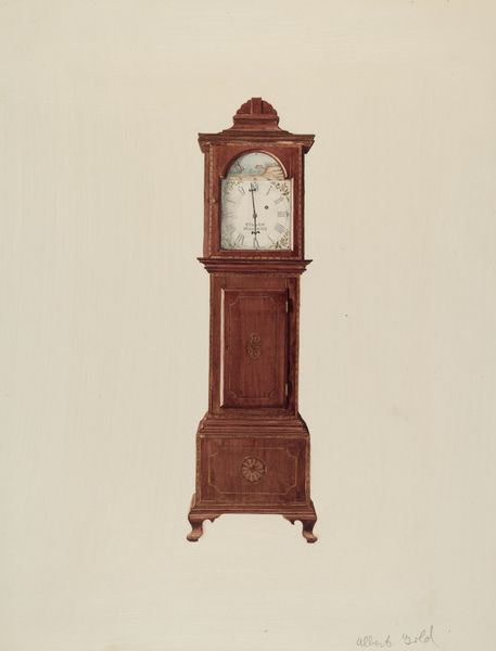 Ferdinand Cartier made this drawing of a shelf clock with what looks like watercolor or gouache on paper. The palette is tight, mostly browns, umbers, and ochres. It's a study in how much you can do with a little, how you can wring endless color and texture from what seems so limited. The surface is matte, absorbent, almost chalky. It feels like a memory. Look at the way Cartier renders the wood grain. It’s so precise, so knowing, but softened by the nature of the medium. The effect is less about perfect representation and more about a kind of reverence for the object. There's a looseness that keeps it from being stiff or overly precious. It’s like Cartier is saying, "I see you, clock, in all your intricate detail, but I also see the poetry in your being.” This reminds me a little of the Shaker craftspeople. They were creating simple, functional objects but with such care and attention that they became sublime. It's a conversation between utility and something beyond.