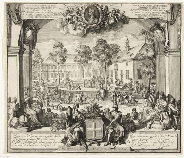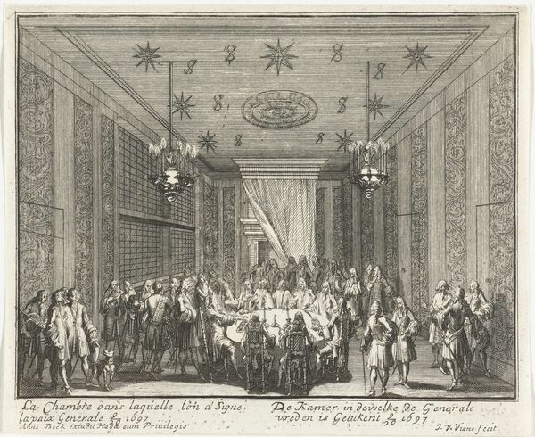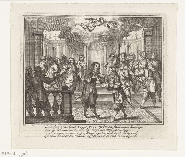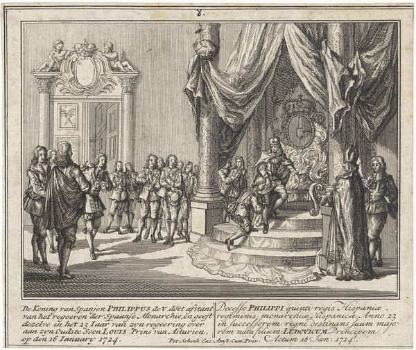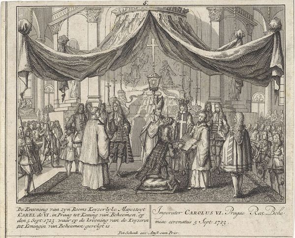 Curator: Welcome. We are standing before a print entitled "Huwelijk tussen Lodewijk XV en Maria Lesczinska," or in English, "Marriage between Louis XV and Maria Leszczyńska." It's attributed to Leonard Schenk, created around 1727. Editor: Immediately striking. There is such incredible detail rendered in such a tiny scale. The perspective is convincing and draws the eye into this vast space. Curator: Precisely! The artist uses precise, almost scientific, linework to delineate the architectural space. Observe the orthogonal lines receding toward a vanishing point, creating a sense of depth. And consider the visual balance – the dense crowd in the foreground is offset by the airy heights of the columns. Editor: But that "depth" serves to diminish the individual, does it not? The work romanticizes and memorializes a highly unequal union—a political alliance masked as holy matrimony. The sheer volume of courtiers and attendees—the faceless mass—underscores the way individuals were subsumed by dynastic ambition. Curator: While that reading holds merit from a contextual standpoint, note how the composition emphasizes a pyramidal structure, focusing on the royal couple elevated at the apex, under that ornate baldachin. That form transcends mere political circumstance, achieving a visual harmony rooted in Baroque principles. Editor: But "harmony" is a dangerous descriptor, isn't it? To portray this event as visually harmonious risks obscuring the forced nature of the arrangement for Maria, a woman bartered for geopolitical stability, with the artist and commissioner both contributing to this myth. We can read it semiotically, seeing the textiles of their clothing communicating their power, status and prestige. Curator: I can agree that it is highly charged, visually rich piece; a product of the precise intersection of visual strategy and social narrative. Editor: Right, which helps highlight the crucial intersection of image and power inherent in representations of state events like royal weddings, thus offering valuable insights for further socio-political investigation.