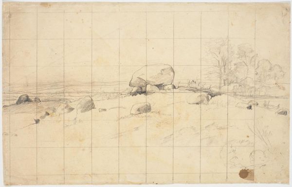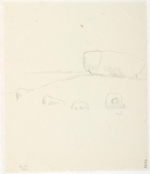 Editor: Here we have "Kæmpehøj (formodentlig) på Brandsø," or "Giant's Hill (presumably) on Brandsø," an ink drawing from 1842 by Dankvart Dreyer, housed at the SMK. It's surprisingly minimalist for Romanticism. The landscape feels so quiet, almost melancholic, dominated by that massive, brooding rock. What strikes you when you look at this piece? Curator: Ah, Dreyer. He had such a wonderful, sensitive touch. What I find fascinating here is the implied scale. See how those small, almost hesitant lines sketch the horizon? They make that boulder feel even more monumental, a silent observer of time itself. Do you feel that sense of timelessness, too? It's as if the rock *is* the landscape, distilled. Editor: Absolutely. It's not just a rock, it's...presence. Did the title influence that feeling for you? Knowing it's likely a burial mound? Curator: Perhaps. But consider the context of Romanticism. They were obsessed with nature's power, with folklore, with national identity. This isn't just a pretty landscape; it's Dreyer engaging with Denmark's past. A past, by the way, steeped in paganism and Viking lore. Makes you wonder what stories that rock could tell, doesn’t it? Imagine the rituals, the whispered secrets... Editor: Wow, I hadn't thought about it that way. It moves beyond simple representation to embody history. Curator: Exactly! And it's a perfect example of how a simple drawing, a seemingly quiet scene, can resonate with so much cultural weight. See, even the sparseness of the drawing seems appropriate. He doesn't overwork it; he lets the stone speak for itself, letting our own imaginations fill the space. Editor: That’s brilliant! I appreciate that subtlety so much more now, after hearing your insights. It feels less like an observation and more like a memory, fading slightly around the edges. Curator: Beautifully put. Sometimes the most powerful statements are the ones whispered, not shouted.