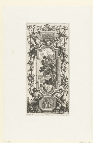 Curator: Looking at this engraving, "Muurpaneel met twee saters onder achthoekige lijst," created in 1647 by Michel Dorigny, the immediate impression is one of incredibly ornate complexity. Editor: Indeed. The line work is astonishingly dense, almost overwhelming at first glance. How would you interpret the symbolism within this Baroque design, given its historical context? Curator: Well, the presence of satyrs points to an engagement with classical mythology, hinting at themes of revelry and earthly pleasures that were circulating throughout the royal courts and the bourgeoisie during this period. Remember, we're only decades from the Thirty Years War. Art served to reinforce power structures. Editor: I see your point, and how it visually conveys power and control, though I am first taken by the rigorous compositional arrangement. The way the artist employs symmetrical balance using line engraving is quite striking, from the acanthus scrolls to the figural depictions and octagonal border framing a classical tree within a formal container. It calls to mind, from a modern viewpoint, a systems-based logic. Curator: I agree with the inherent formal values, however, I tend to believe these choices reinforce not a balanced perspective but instead one that reflects strict gender, class and race hierarchies. Editor: Your argument does provide another avenue for investigation; it asks viewers to consider historical conditions when looking closely. Curator: Yes, I always want to emphasize art as an indicator, if not actor, in times of political unrest and social change. Editor: Interesting, this exploration certainly illuminates aspects often missed through purely formal reading. Thank you. Curator: Thank you as well; I appreciate this dive into Michel Dorigny's Baroque sensibility through an updated theoretical lens.