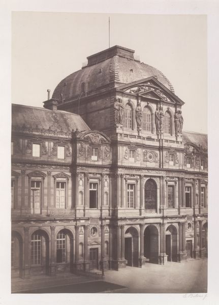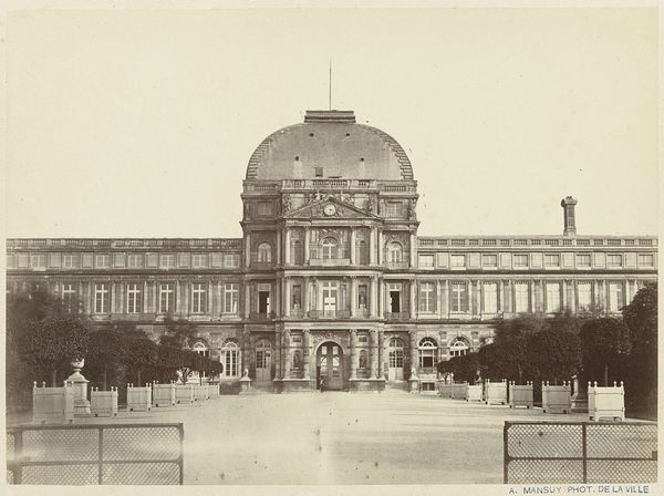 Editor: So, this photograph, "Le Louvre: Pavillon de l'Horloge" by Édouard Baldus, likely taken sometime between 1855 and 1878, captures a grand architectural view. It feels so static, almost like a stage set. What do you see in this piece beyond the architecture itself? Curator: The Louvre isn’t merely stone and mortar, but a loaded signifier. Notice how Baldus frames the Pavilion; the symmetry, the classical allusions in the sculptures… It's all designed to project power, permanence, and a specific narrative of French identity, drawing on the cultural memory of the neoclassical. What feelings arise for you looking at that central clock? Editor: It's almost like time is frozen; a captured moment, which is ironic considering it’s a clock tower. The sharpness of detail feels very deliberate. Curator: Exactly! Consider photography’s rise during this period. It allowed for wider dissemination of these carefully constructed images. They weren't just documenting reality, but actively shaping perceptions, especially in relation to progress and national pride. How might this image influence someone’s understanding of Paris, or even France? Editor: I guess it’s presenting an ideal, a timeless strength... a very curated reality! So it’s not just a picture of a building. It's communicating values, reinforcing ideas through a visual language. Curator: Precisely. Baldus is utilizing the Louvre, this incredibly dense symbol, as a means of conveying much larger cultural ideas. That clock reminds us how even time is subject to control. What do you make of that now? Editor: Now I’m seeing how even a seemingly straightforward photograph like this can be a complex statement about history, power, and cultural identity. I definitely will view images of buildings differently going forward!