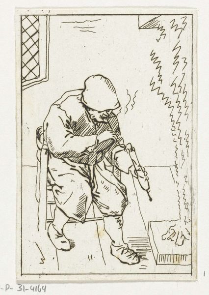 Curator: Anthonie van den Bos's "Man Steekt Zijn Pijp Aan," a genre scene rendered in pen and ink, catches the eye here at the Rijksmuseum. What are your initial impressions? Editor: It has a raw quality to it, almost like a candid shot. The diagonal composition is intriguing; it pulls the eye down and to the right, following the smoker’s gesture and the flow of smoke. Curator: Absolutely, the use of line work is quite evocative, lending itself to the representation of everyday life. Think about what pipe smoking may have meant then—a leisure activity linked to male bonding and, increasingly, to Dutch colonial enterprises through tobacco. Editor: Let’s focus on that act of lighting the pipe. You see the hand holding a burning spill toward the bowl of the pipe – how meticulously observed. The process of creating fire, providing the means for relaxation. Curator: Right, this piece resonates deeply with 18th- and 19th-century Dutch society, particularly its intricate ties to tobacco cultivation and global trade. The image subtly touches on the dynamics of labor, leisure, and even empire. Editor: There's the wood-paneled wall in the drawing that reminds me of a Delft interior. This rendering, through humble materials and simple scene, provides us glimpses of a space in someone's life. Curator: And we can not deny how that interior situates the man within his culture, subtly signaling class and belonging. We have the smoke almost dancing freely in the confined place: a symbol of aspiration and transgression? Editor: Transgression is the right word, I would say. By making and then presenting smoke through ink on paper the artist alludes to not only to process, but also to the freedom for creativity which both men take. Curator: A truly valuable point. "Man steekt zijn pijp aan" provides a multilayered experience, allowing a complex dive into themes of class, empire, identity, and labor practices woven into Dutch life at the time. Editor: And through studying those material processes, the social position of the smoker comes even more alive, don't you think?