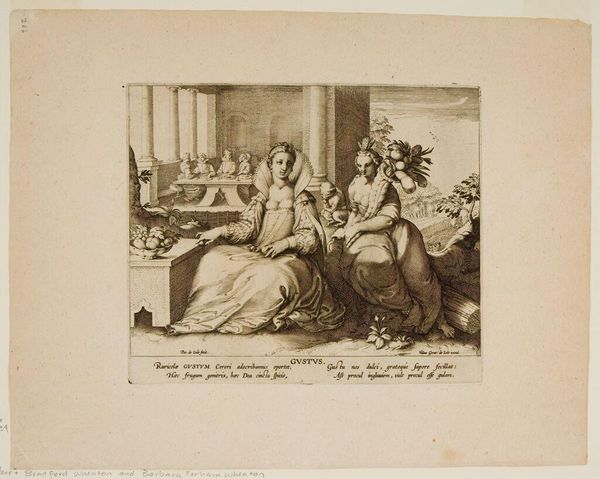 Curator: This is Jacques Firmin Beauvarlet's "The Cupid Seller," an engraving that presents a curious scene. Editor: It feels staged, almost performative. The neoclassical setting and draped figures give it a studied, cool detachment. I wonder about the process involved in producing such intricate detail. Curator: The composition is deliberately arranged—note the pyramidal structure formed by the figures and the urn. The gaze directs us towards the offered cupid. Editor: Yes, but consider the labor implied. The copperplate engraving technique demands precision and repeated, physical effort. Where did Beauvarlet learn this skill? Curator: Indeed, the sharp lines and careful shading create a sense of depth and volume. Notice how Beauvarlet uses light to highlight the figures' forms. Editor: And how are those materials sourced? Who is profiting from the making of this image and distribution of it? Curator: It is a work of intriguing complexity. Editor: For certain. This makes me reflect on the social forces that enable it.