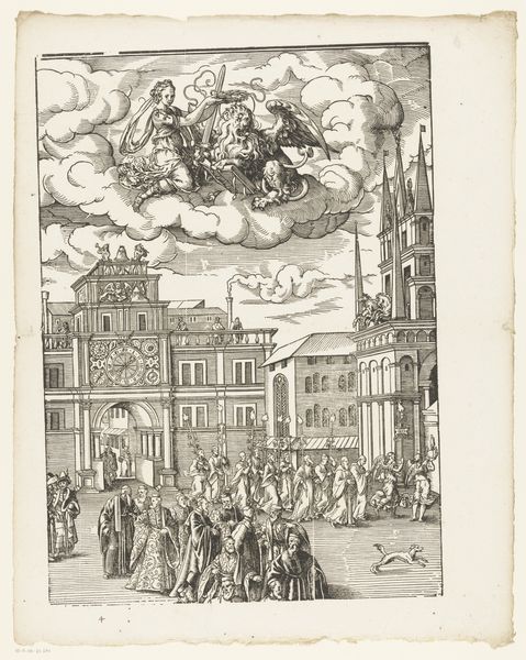 Curator: Here we have "Spotprent op de oude en de jonge pretendent, 1745," which translates to "Print on the old and the young pretender, 1745," created anonymously, sometime between 1745 and 1746. This engraving offers a fascinating window into the political climate of the period. Editor: It strikes me immediately as chaotic yet meticulously detailed. The eye is drawn to the bustling town square and the allegorical figures fighting above. The contrast between the mundane setting and the fantastic elements creates a sort of jarring unease. Curator: Precisely. It encapsulates the Jacobite threat to the Hanoverian monarchy through a potent mix of realism and symbolism. The scene isn't merely descriptive; it's a pointed commentary on power, succession, and the potential disruption of societal order. We see it set within an urban context with an allegorical rendering. Editor: Yes, I note how the engraver has paid such meticulous attention to details such as architectural rendering and figural composition. You have figures, then a detailed architectural rendering that is juxtaposed against ethereal or floating elements. But does all of this detail work to resolve the overall lack of formal coherence, and does the composition contribute to our understanding? It looks, for a lack of a better term, too busy, like one cannot figure out a formal vantage point of interest to properly appreciate it. Curator: The seeming disarray speaks volumes about the anxieties of the time. The artist masterfully utilizes the print medium to disseminate complex political ideas among a broad audience. He comments on social divisions. Is he subtly siding with either group of social classes by contrasting them? The chaos on the foreground is mediated by some element of social activity. The political anxieties can only be explored because a relative social stability persists in this city. Editor: I find that very helpful. Through the detailed formal rendering, and semiotic reading of visual and contextual metaphors, we gain additional clarity and further deconstruct social and historical layers of meaning, as well as better appreciating and contextualizing all the formal complexity. Curator: Yes, exactly. Thinking through those contextual factors can help in deconstructing the power structures that shaped this historical moment in the piece. Editor: Absolutely, by understanding its composition as a representation of anxiety, and unpacking it through structural methods and political history, the work yields even greater meaning.