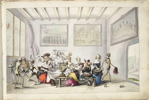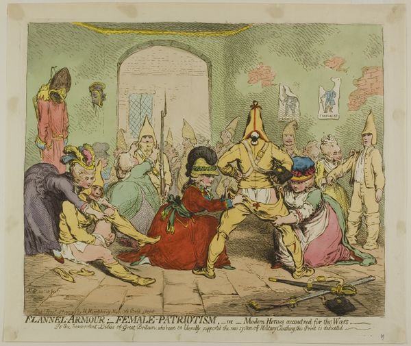 James Pollard created "Cottagers' Hospitality to Travellers or The Coach Broke Down," using an etching technique. The composition splits the scene into two distinct groups with a dramatic contrast between light and shadow. The left side glows, revealing an intimate scene of assistance, while the right side is shrouded in darkness, obscuring the figures. The beam of light, central to the composition, acts as a structural element, dividing and connecting the two groups. This division may challenge the notion of a unified social space, suggesting a commentary on class distinctions. The act of hospitality is visually highlighted, but the formal arrangement implies underlying tensions between the hosts and the travellers. It is the light, both literally and metaphorically, that throws these dynamics into sharp relief. The artist uses light to question and redefine our understanding of social exchange.