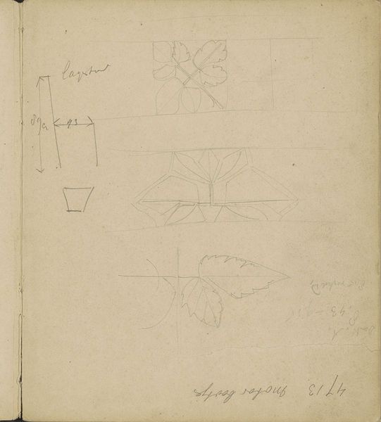 Editor: Here we have Carel Adolph Lion Cachet’s "Design for wall portraits in the smoking room," made around 1928, using mixed media, drawing, and pencil on paper. At first glance, it resembles an engineer's notebook page, with calculations and names scribbled down next to abstract shapes. How would you interpret this work in the context of its time? Curator: Considering the social context of the 1920s, especially with the rise of Modernism, this sketchbook page reveals several layers of meaning related to design, functionality, and social spaces. Smoking rooms were a symbol of bourgeois leisure and masculine identity. Cachet appears to be designing not just a portrait series, but defining a certain aesthetic and perhaps even reinforcing social hierarchies through art in that private space. Note the references to dimensions. Does this emphasize that art can define and shape social environments? Editor: That's a great point about social hierarchies. So, the geometric shapes, are those abstract portraits or more like placeholders for where portraits would go? Curator: A little of both, I believe. Cachet may have been working to integrate portraiture with modernist geometric abstraction, balancing individual identity with broader aesthetic trends. The sketches imply he was designing not just art, but atmosphere. Considering who these portraits were of, might reveal more about the intentions and cultural statement he aimed to make within that smoking room. The choice of lettering also shows deliberation in the aesthetic and contributes significantly to our perception. Editor: I see. The handwritten elements almost feel like a rejection of mass production, giving it a personal, intimate quality even within a formal setting. Curator: Exactly. By intertwining formal design with these human touches, Cachet blurred the boundaries between art, function, and individual expression, echoing broader debates about art’s role in a rapidly modernizing society. This blurring really emphasizes art as not merely decoration but social commentary. Editor: That's really insightful. I hadn’t considered how much a seemingly simple sketch could reflect those deeper societal conversations about class, design and modernity!