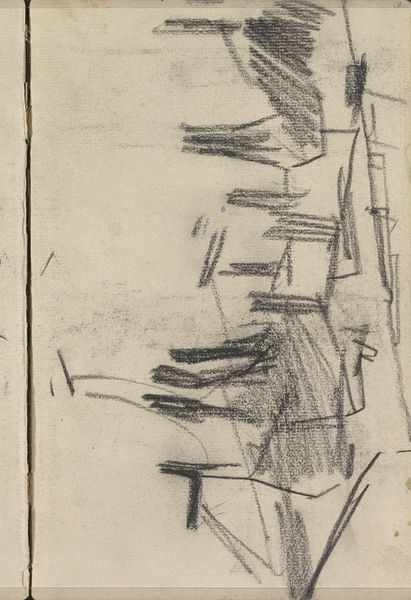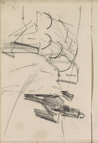 Editor: Here we have George Hendrik Breitner’s "Studie, mogelijk van koeien of paarden," or "Study, possibly of cows or horses," created in 1883 with graphite. The quick strokes of graphite give it such an ephemeral feel, like a fleeting glimpse. What can you tell us about it? Curator: This sketch, though seemingly simple, acts as a container for latent energy. The abbreviated lines are shorthand for something quite powerful. Notice how the artist uses dark shading not to define the animal forms literally, but to suggest their mass, their weight, their very being. Think of it almost as a primal connection to nature. Does the rawness of the lines perhaps communicate something of our own untamed, instinctive selves mirrored in these animals? Editor: That's a fascinating way to put it. It does feel very immediate and unfiltered. What do you make of the ambiguous shapes? I see 'cow' and 'horse,' but also barely-there lines. Curator: Indeed. The sketch hovers between representation and abstraction. In iconographic terms, animals often bear symbolic weight tied to our psychological states. The horse might suggest power and freedom, while cattle hint at abundance and provision. Their ambiguous forms here perhaps invite viewers to project their own feelings and experiences onto the image. The artist uses the animals' familiar shapes and our associations to them in order to get something across to us. What do those lines mean to *you*? Editor: I see the potential of something monumental within those few lines. Breitner has captured an essence, not a portrait. I'm left feeling energised and invited to add my own experiences to it. Curator: Exactly! And that energetic dialogue between viewer and art, bridging the familiar and the unknown, allows art to shape culture's continuous narrative through powerful symbolism.