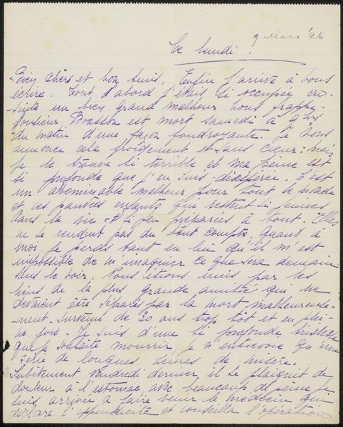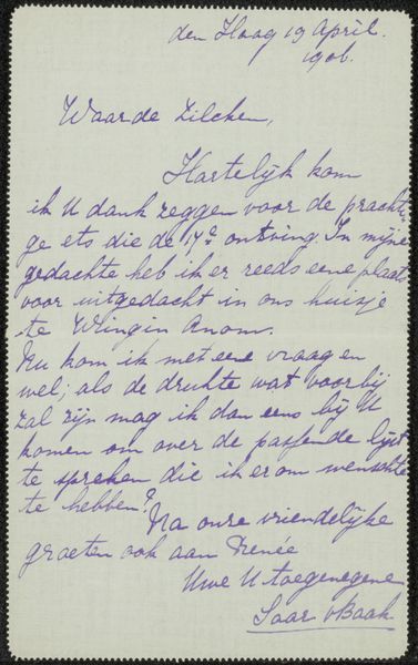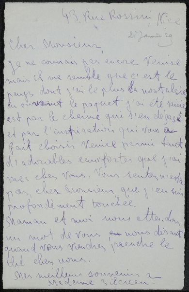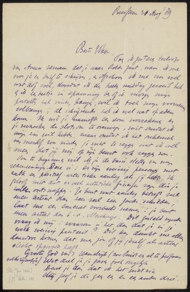 This letter, to Philip Zilcken, was written in 1926 by C. Hinlopen. It’s made with ink on paper, but it’s also a very physical thing, you know? Like, someone actually sat down and wrote this, probably with a pen they dipped in ink. The ink is thick in places, especially where the writer paused or pressed harder. You can see the looping, cursive handwriting, almost like a dance across the page. Look at the way the ‘s’ and ‘t’ connect, kind of floating above the line. It’s like the words are holding hands. There’s something intimate about handwriting, like you’re getting a glimpse into the writer's thoughts and personality. This reminds me of Cy Twombly’s scribbled paintings, the way he made writing into art. Art’s always talking to other art, across time, isn't it?
