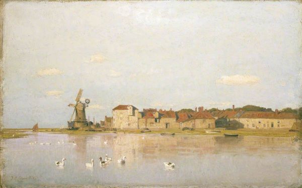 Eugène Boudin captured this view of the Francais tower in Le Havre using oil on canvas. Notice how the composition is structured by contrasting textures and forms. The rough, earthy materiality of the tower and the quayside is set against the fluid reflections in the water, while the rigid architecture contrasts with the organic shapes of the boats and sky. Boudin uses a limited palette of browns, grays, and blues, creating a subdued atmosphere. This echoes the growing industrialization of port cities in the 19th century and reflects a sense of transition and change. The tower looms large, yet its crumbling facade suggests a loss of power. Boudin plays with the semiotics of space, using the foreground to draw us into the scene and the background to hint at a world beyond. The dynamic brushwork creates a sense of movement, subtly disrupting any fixed interpretation. It’s a dance between the tangible and the transient, inviting us to question the nature of permanence.