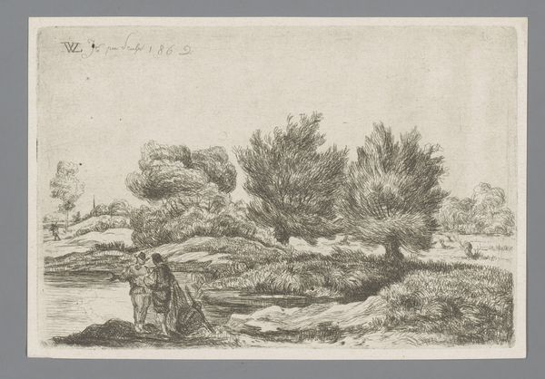 Alphonse Legros created this etching, "View of a Farm," capturing a humble, rural scene. The thatched roofs of the farm buildings sit nestled in the landscape, evoking a sense of shelter and connection to the earth. This imagery of the rustic dwelling has roots stretching back through art history: from medieval illuminated manuscripts to the landscapes of the Dutch Golden Age, the simple home symbolizes both security and the pastoral ideal. Consider how this contrasts with the towering structures of urban life, embodying a longing for simpler times. Even today, we see echoes of this in modern art and photography, revealing a collective, perhaps subconscious, desire to return to nature. The depiction of the farm is not merely a visual record; it's a vessel carrying centuries of cultural memory and emotional longing.