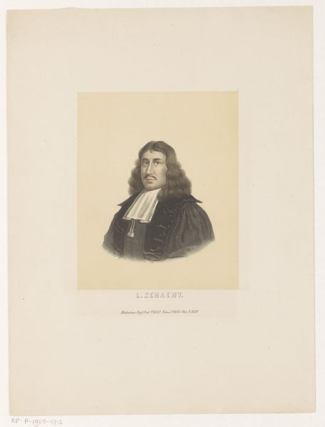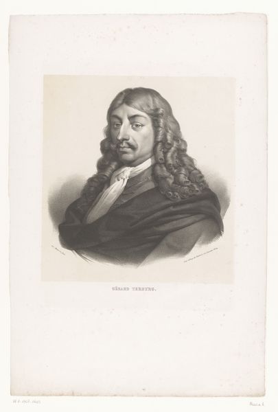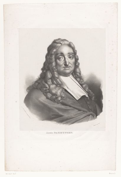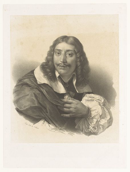 This is Nicolas Maurin’s lithographic portrait of Jusepe de Ribera. The composition is immediately striking for its contrasts—light and dark, defined versus soft. Maurin masterfully uses chiaroscuro. Notice how the stark white collar frames Ribera's face, drawing our eyes to his expression. The face itself, rendered with delicate lines and subtle shading, contrasts sharply with the dark, enveloping coat. This contrast isn't just aesthetic; it evokes a sense of drama and intensity. The soft, almost romantic treatment of the hair adds another layer, creating a tension between the man's inner world and public persona. The formal qualities of the portrait, particularly the interplay of light and shadow, offer a glimpse into the cultural codes of representation of the time. The formal structure destabilizes the conventional values of portraiture by engaging with new ways of thinking.