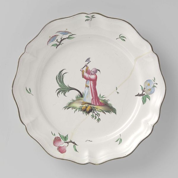 Editor: Here we have an 18th-century saucer by an anonymous artist, crafted from ceramic, enamel and glass with painted decorations. It strikes me as quite charming in its simplicity. What’s your perspective on it? Curator: The key here is understanding the object as the result of labor and access to specific materials. The ceramic body itself speaks volumes about trade routes and access to the kaolin clay necessary for its production. Do you see the marks left from the painter? Editor: I do. They seem intentionally naive. Was this kind of painting considered craft, art, or something in between back then? Curator: That's a crucial question! The production of decorative arts like this involved specialized workshops, often with a division of labor. Some workers formed the object, others applied the enamel and painted the decoration, indicating levels within the labor force. We can analyze this hierarchy of labor. Think about what these roles mean to the finished object. How might its function influence its design? Editor: So the function of a saucer dictated not only its shape but the kind of artistic labour that was deemed appropriate. The fact it’s made for the table, rather than display, affects the visual complexity. It's everyday art. Curator: Precisely. We can analyze how such objects reinforced social hierarchies of consumption. This piece provides insights into 18th-century European trade, artisanal labor practices, and class structures surrounding domestic life. It’s so much more than just a pretty design, right? Editor: I agree. Seeing it as a product of labor, material availability, and consumption really opens it up to broader interpretations. Curator: Exactly. Now you’re looking at the means of production that have defined the value, beyond aesthetics alone!