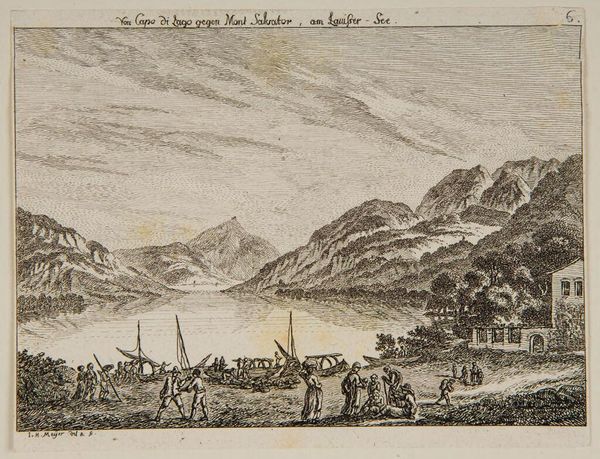 Curator: Looking at this image, "Oberwyl on Lake of Zug" by Johann Heinrich Meyer, it strikes me as a really peaceful, meditative landscape. What is your first impression? Editor: It feels a bit…clinical, almost? The precision of the lines, the stark contrast. It’s like a cartographer's record of the sublime, not a painter's embrace of it. Curator: I get that. Meyer, who lived from 1680 to 1752, probably saw the landscape as something to be carefully documented, cataloged even. It’s interesting how social priorities shaped how art was perceived. Editor: Exactly! This is landscape as property, as resource. The mountains loom, but it's really about taming nature, organizing space. But at the same time, there's a raw beauty that peeks through those etched lines. Curator: I agree, even through the precise lines, I think, there is still a sense of awe conveyed within the grandeur of the mountains that rise behind the buildings on the shoreline. Editor: So, ultimately, a lovely tension between control and untamed nature.