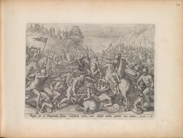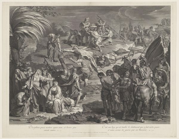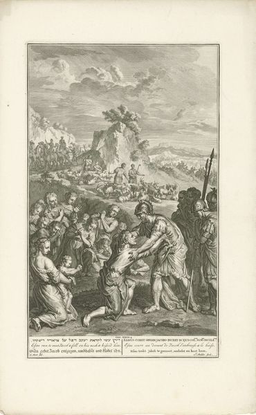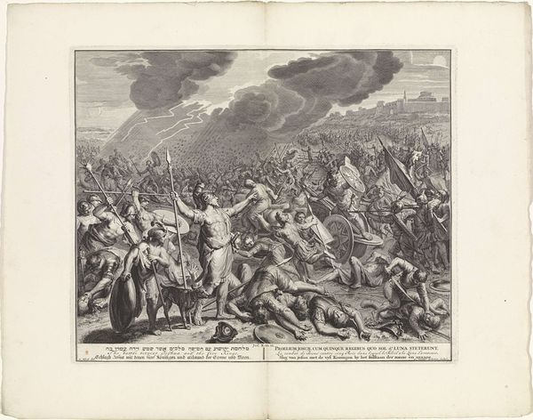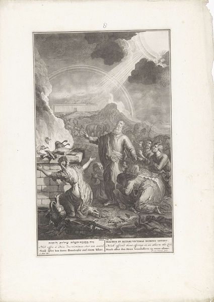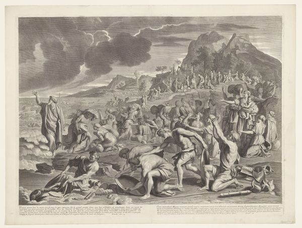 Gilliam van der Gouwen produced this print of Mozes on Mount Sinai in the 18th century using etching and engraving techniques. These processes involve meticulously incising lines into a metal plate, applying ink, and then transferring the image to paper under pressure. Look closely, and you'll notice how the density of lines creates areas of light and shadow, giving depth and drama to the scene. The image depicts Moses receiving the Ten Commandments amidst a scene of divine power. The fine lines used in the printmaking process allow for intricate details, from the expressions of awe and fear on the faces of the Israelites to the depiction of lightning. The labor-intensive nature of printmaking reflects a period where craftsmanship and manual skill were highly valued. Van der Gouwen's work demonstrates a mastery of technique, transforming a biblical narrative into a tangible artifact. By valuing the material and the making, we recognize the interplay between artistic skill, cultural context, and the creation of meaning.