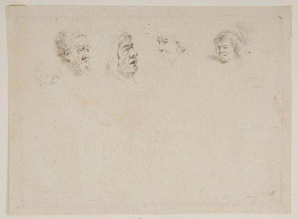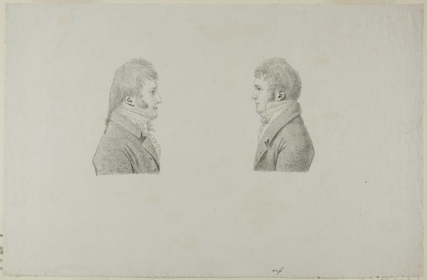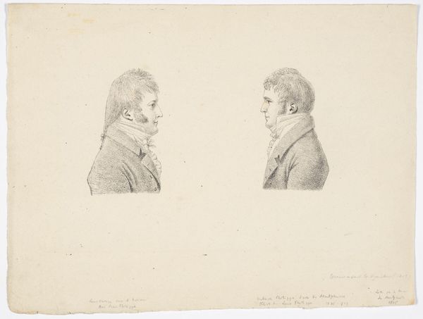 Curator: At first glance, this lithograph whispers of elegance, like a forgotten sonnet. It feels quite intimate despite depicting three individuals. Editor: Indeed. This is “Bust Portraits of Three Brothers,” a work from 1805 attributed to Antoine Philippe d'Orléans. It presents us with three neatly rendered portraits, likely of noble lineage, executed with delicate lines on paper. Prints like these circulated widely during the period. Curator: You know, those wispy lines are what initially caught my eye. It’s like capturing a fleeting thought, a sketch of brotherhood. There's something so…transient about the piece, don’t you think? Are we looking at this through rose-tinted glasses, knowing they were nobility? Editor: It's essential to consider the historical context. Neoclassical art often sought to revive ideals of virtue and order, something we see reflected in the subjects' stoic countenances. Yet prints also democratized art to some degree, offering access to a wider public beyond court circles, helping to spread these values beyond select audiences. Curator: Yes, their eyes seem to hold the weight of expectation and power... It's as if their gaze is meant for posterity and a certain "brand," perhaps? Editor: Precisely. And the choice of lithography allowed for relatively easy replication, ensuring the family’s image was perpetuated. This portrait probably played an important role in shaping public perception. These sorts of items were certainly consumed by a larger number of people beyond just family members. Curator: The subtle detail in their dress amidst the simplicity of the drawing – it hints at privilege and careful self-fashioning in a world where appearances were everything. How poignant is that? Editor: I agree, the work beautifully encapsulates the performative nature of identity within a specific historical and political context, reflecting both personal and societal ambitions through something as seemingly simple as a portrait. Curator: Looking at this piece, you are looking at the world through their world; as a final thought, to imagine these brothers, what they felt, who they loved. What power! Editor: In short, art not only gives us the what, but also suggests the how and especially the why of the social structures that enable and constrain it. Thank you for highlighting this today.